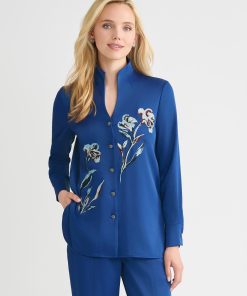Misook Women’s Floral Embroidered Crepe De Chine Tunic – True Fit | Black & White
