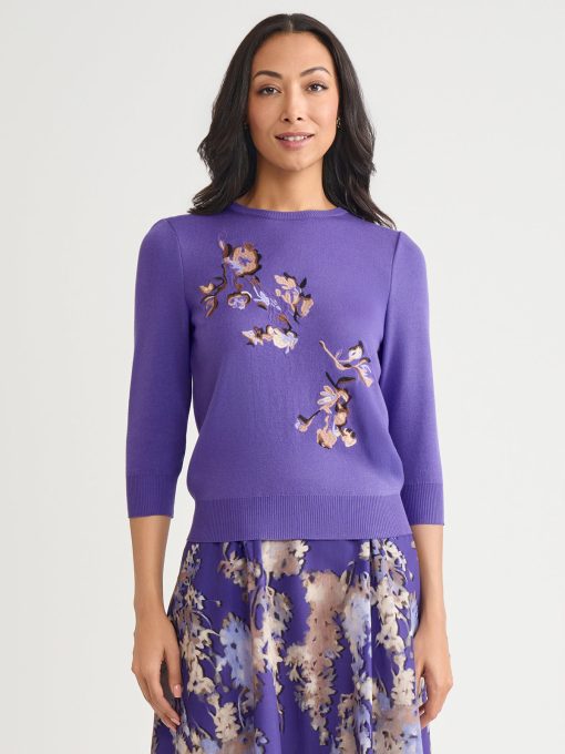 Misook Women’s Embroidered Floral Soft Knit Sweater – True Fit | Concord Purple & Viola & Truffle & Charmeuse & Biscotti & Black