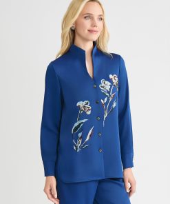 Misook Women’s Floral Embroidered Crepe De Chine Tunic – True Fit | Black & White