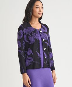Misook Women’s Heritage Checkered Trim Knit Jacket – True Fit | Concord Purple & Black & New Ivory