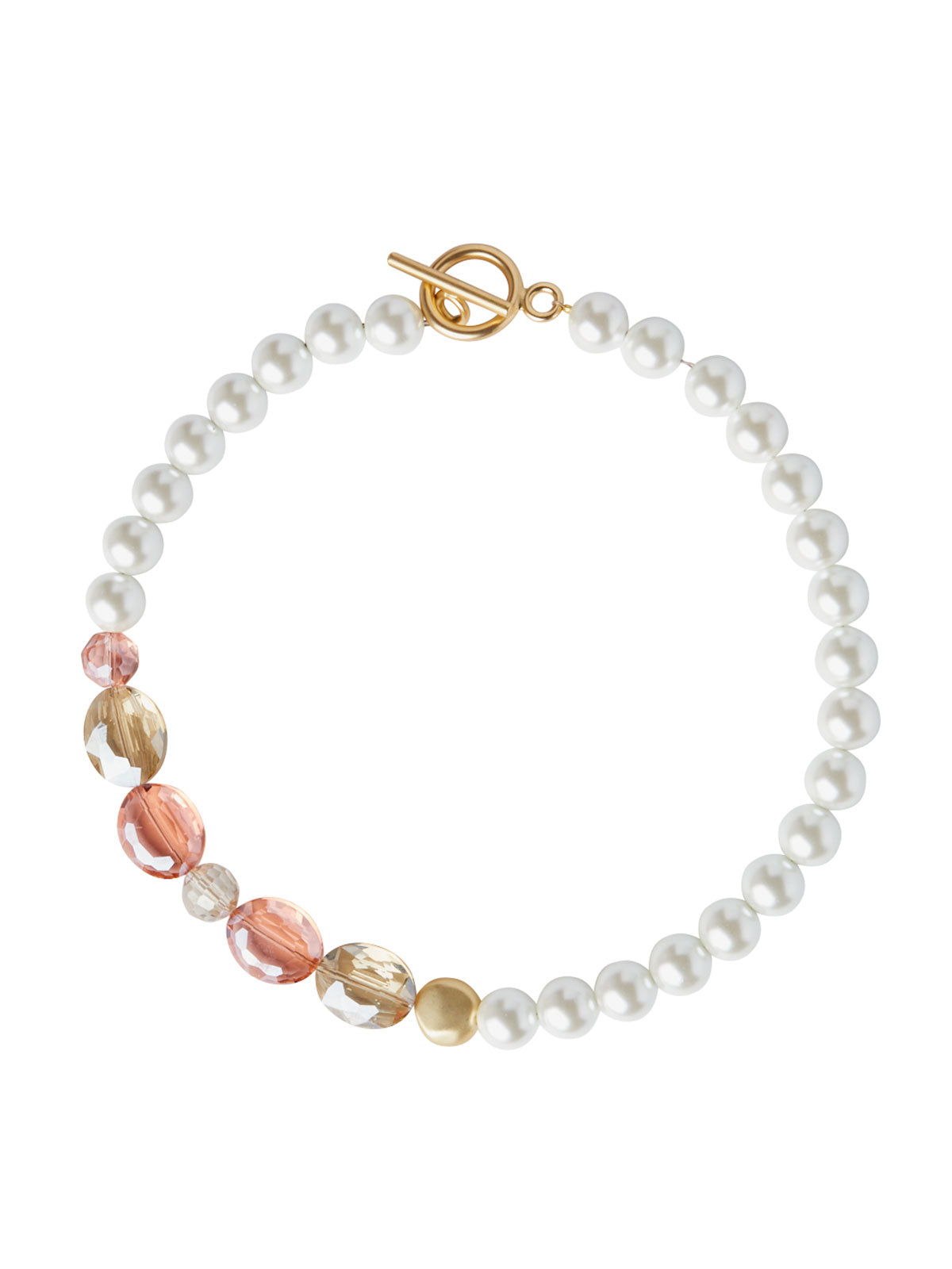 Elevate your look with our Matte Gold Peach Crystal Necklace. Enjoy the ease of wear with the toggle closure at the back. The asymmetrical design makes this piece and interesting addition to your collection.