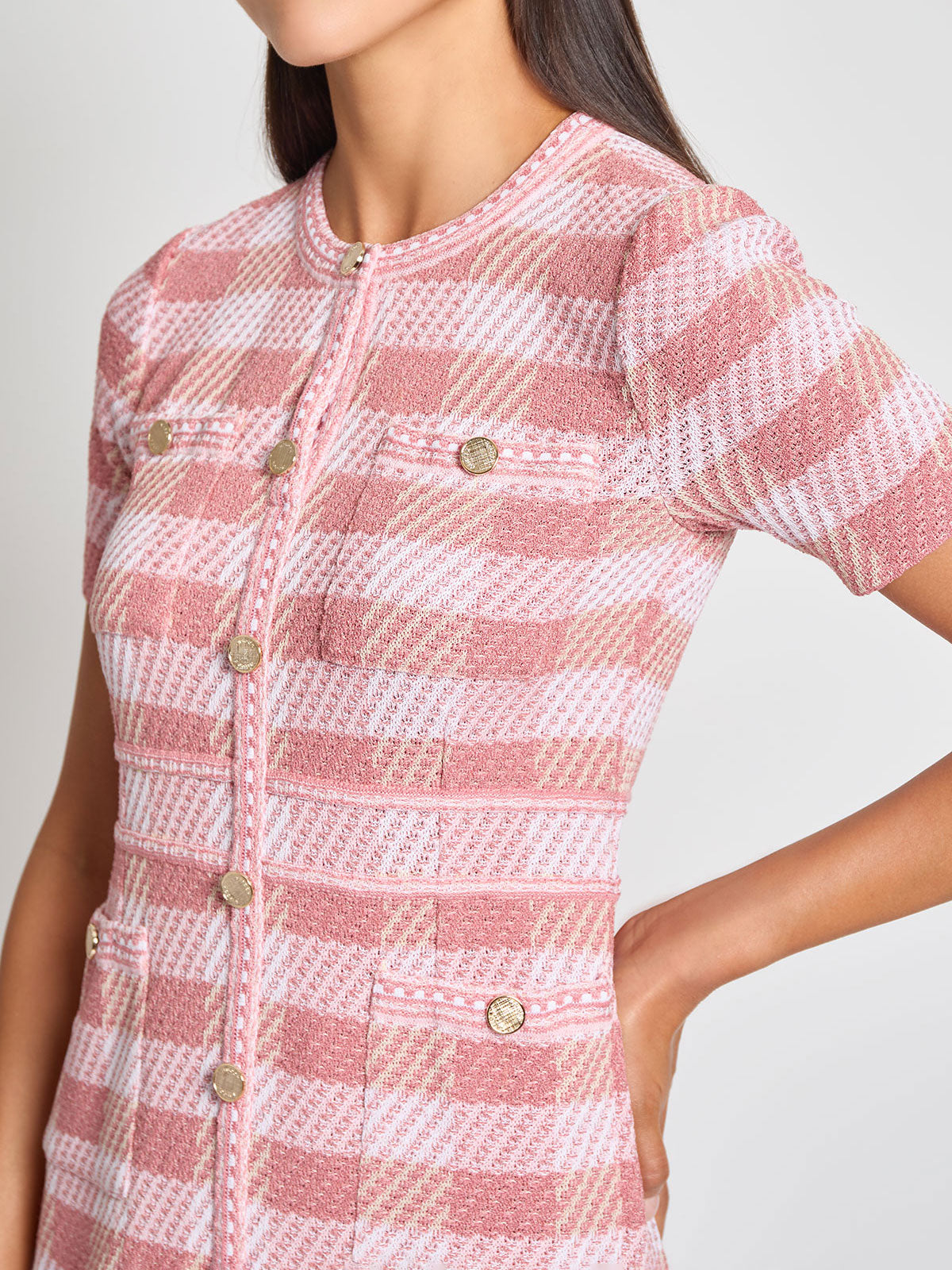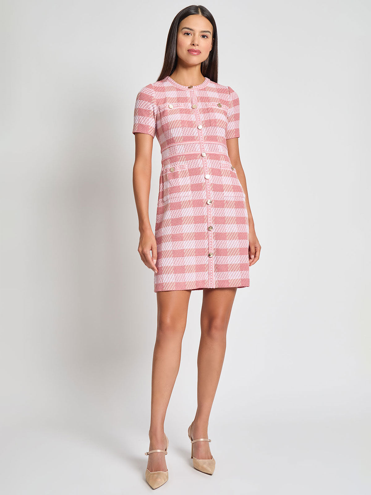 Misook Women’s Bold Plaid Tweed Knit Sheath Dress – Modern Fit | Honey Suckle & Soft Blush & Biscotti & White