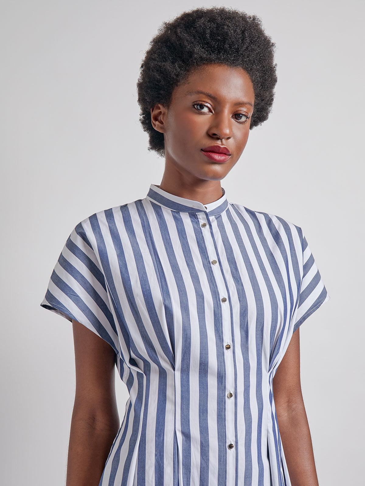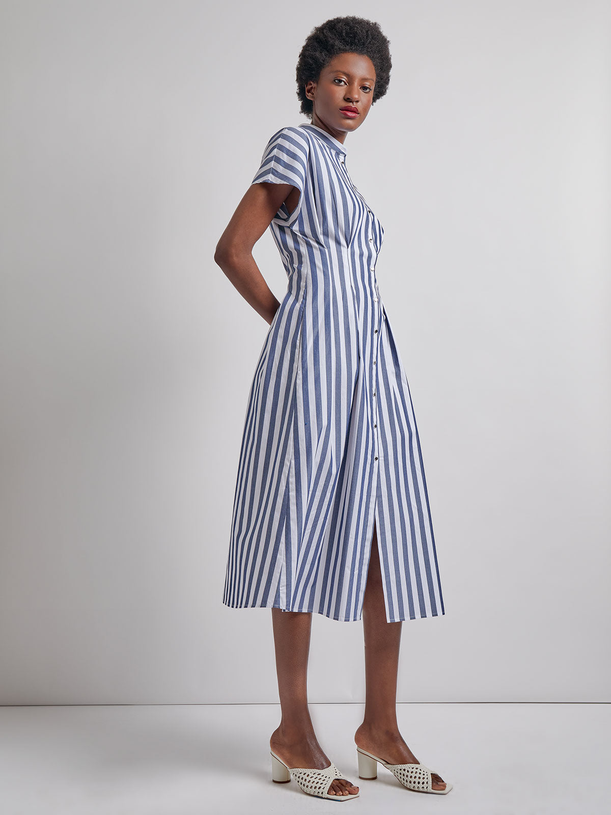 A symphony of grace and sophistication, our Maxi Fit & Flare Button Front Dress is crafted from crisp and durable cotton for a polished look. The dress boasts a flattering fit & flare silhouette that exudes timeless elegance. The stand neck collar and button front closure add a touch of refined allure, while the drop shoulder short sleeves evoke a sense of understated chic. Delicate pleats adorn the dress, adding depth and movement to its graceful silhouette. Effortlessly transition from day to night with this versatile piece, embracing its refined charm that captivates attention at any occasion, showcasing the epitome of feminine grace and enduring style. 100% Cotton; Unlined Hand Wash in Cold Water; Do Not Bleach Fit & Flare Silhouette; Women’s XS Dress Length is 48″ Drop Shoulder Short Sleeves (14″ from Center Back) Woven Cotton Maxi Dress Stand