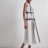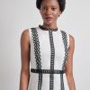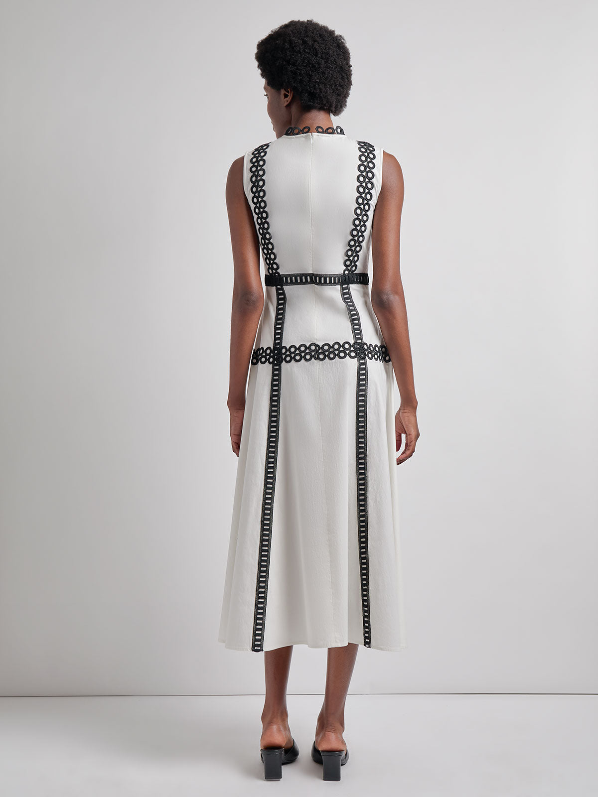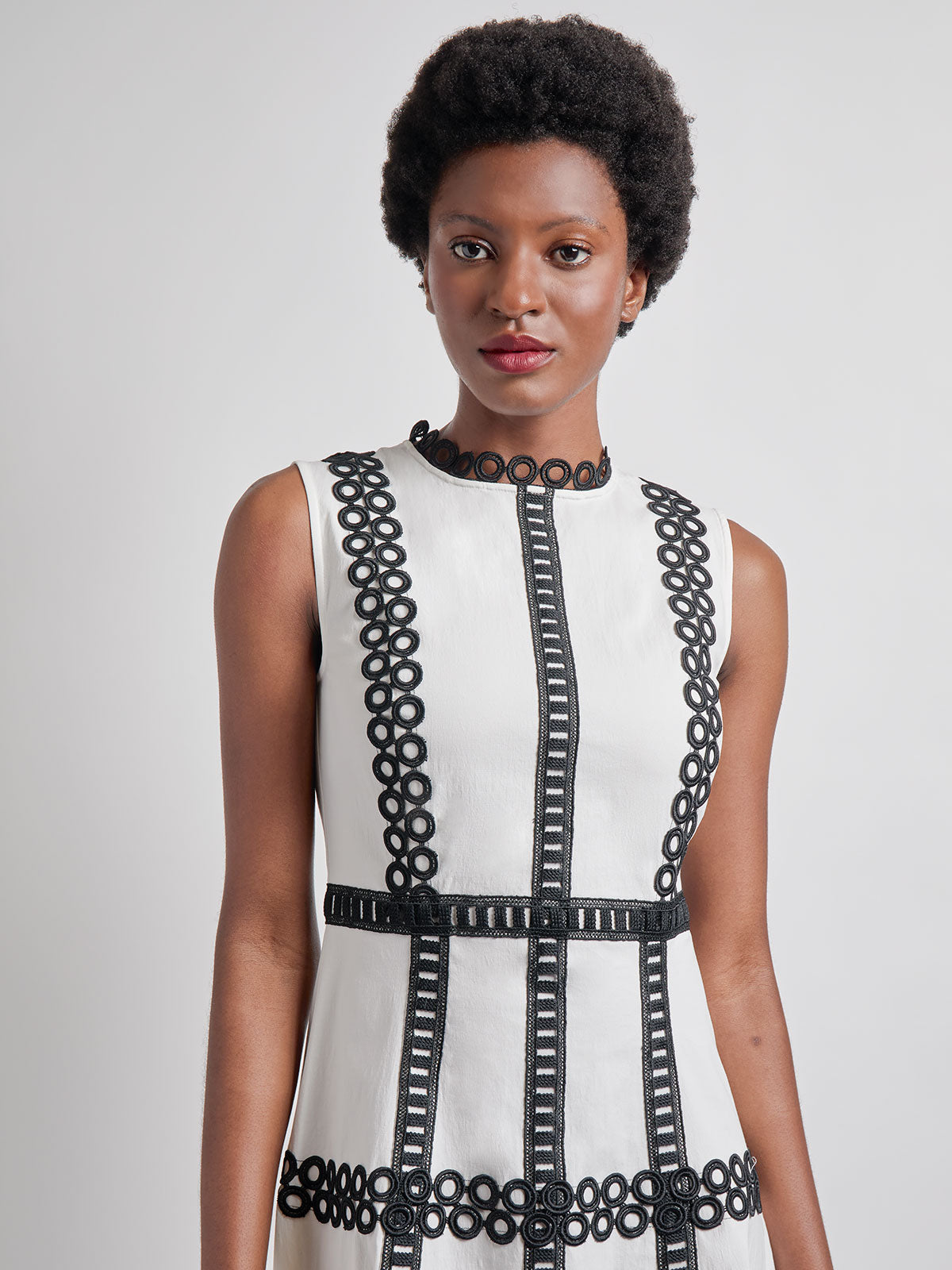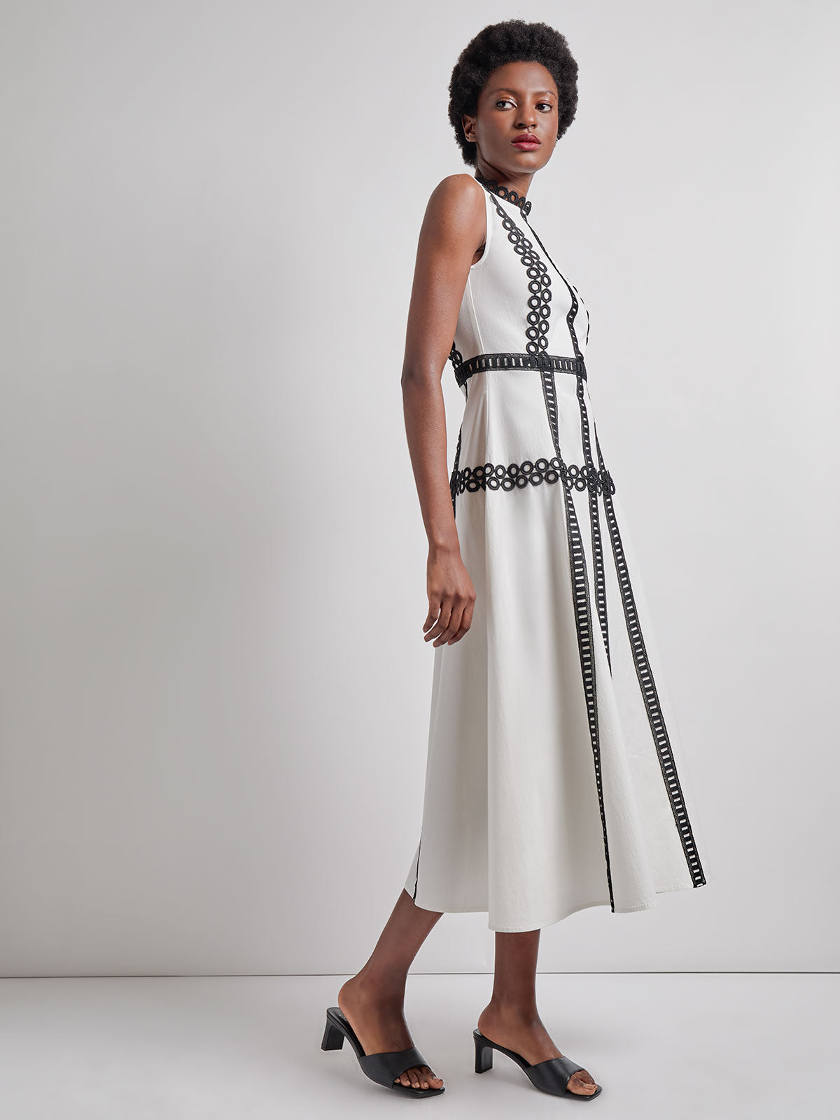 Enchant in the epitome of timeless elegance with our Maxi Fit & Flare Dress, a sartorial masterpiece that seamlessly weaves together grace and sophistication. Crafted from White cotton with delicate Black eyelet trim, this maxi dress boasts a fit & flare silhouette that gracefully accentuates the feminine form. The jewel neck collar and back zipper closure add a touch of refined charm, while the sleeveless design exudes understated sophistication. The decorative eyelet trim creates an intricate and enchanting detail, elevating the dress to a work of art. Embrace the allure of modern romance with this exquisite piece, designed for the woman who appreciates the harmonious blend of classic style and contemporary allure. 100% Cotton; Unlined Trimming: 100% Polyester Hand Wash in Cold Water; Do Not Bleach Woven Cotton Eyelet Trim Maxi Dress Jewel Neck Collar; Back Zipper Closure Sleeveless; Decorative