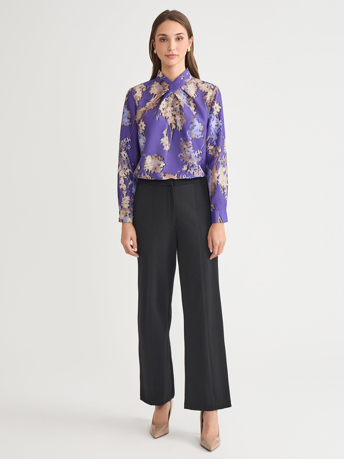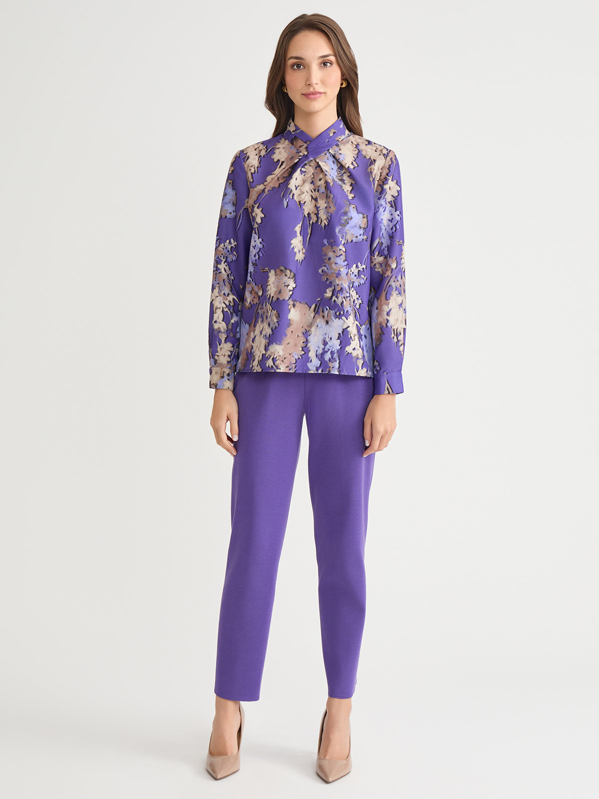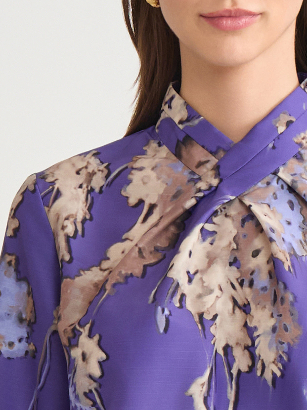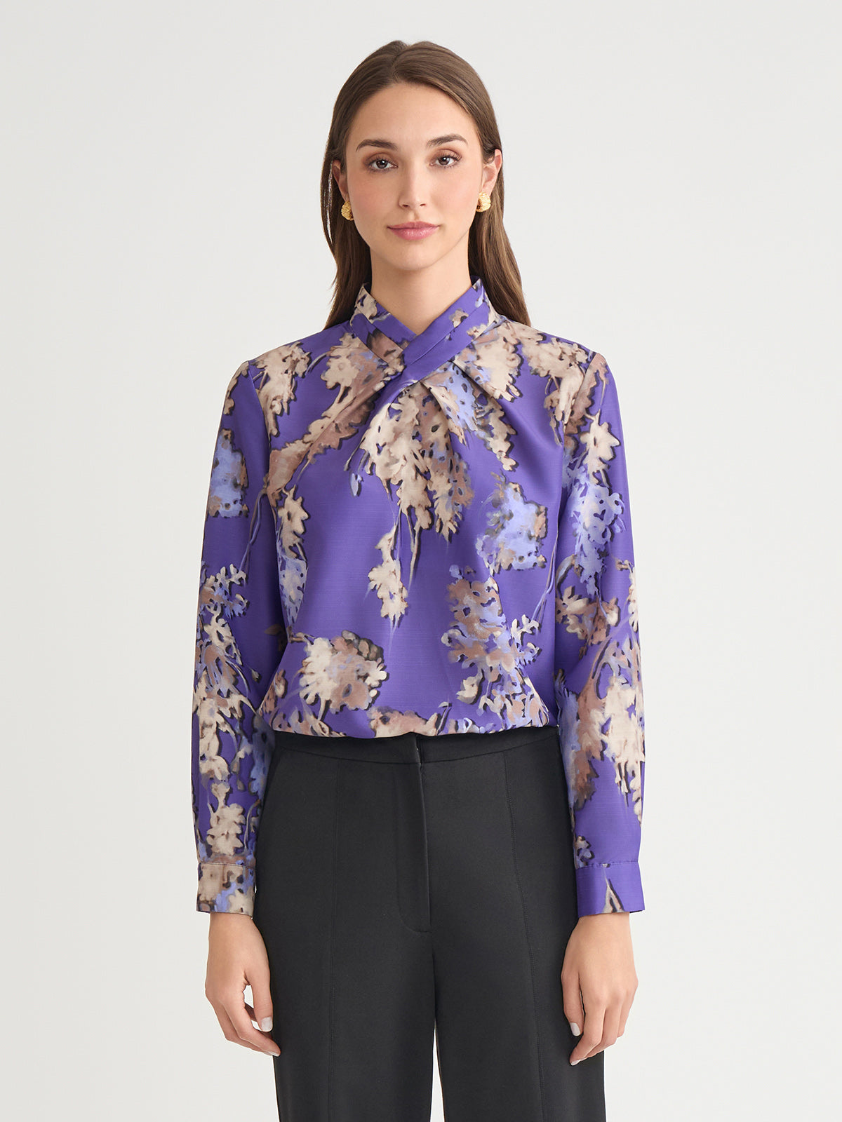 Misook Women’s Floral Crepe De Chine Cross Neck Blouse – True Fit | Concord Purple & Viola & Truffle & Charmeuse & Biscotti & Black