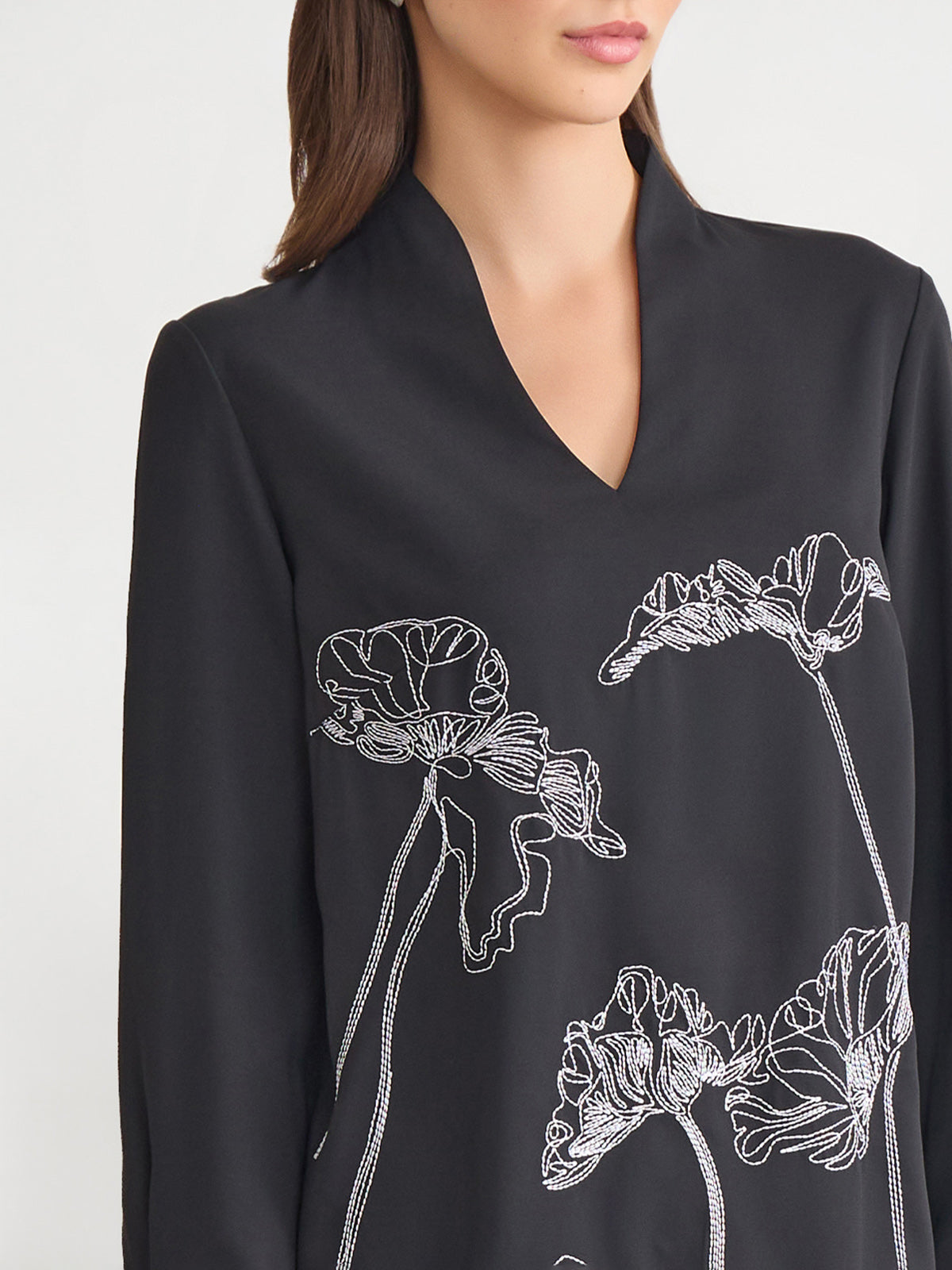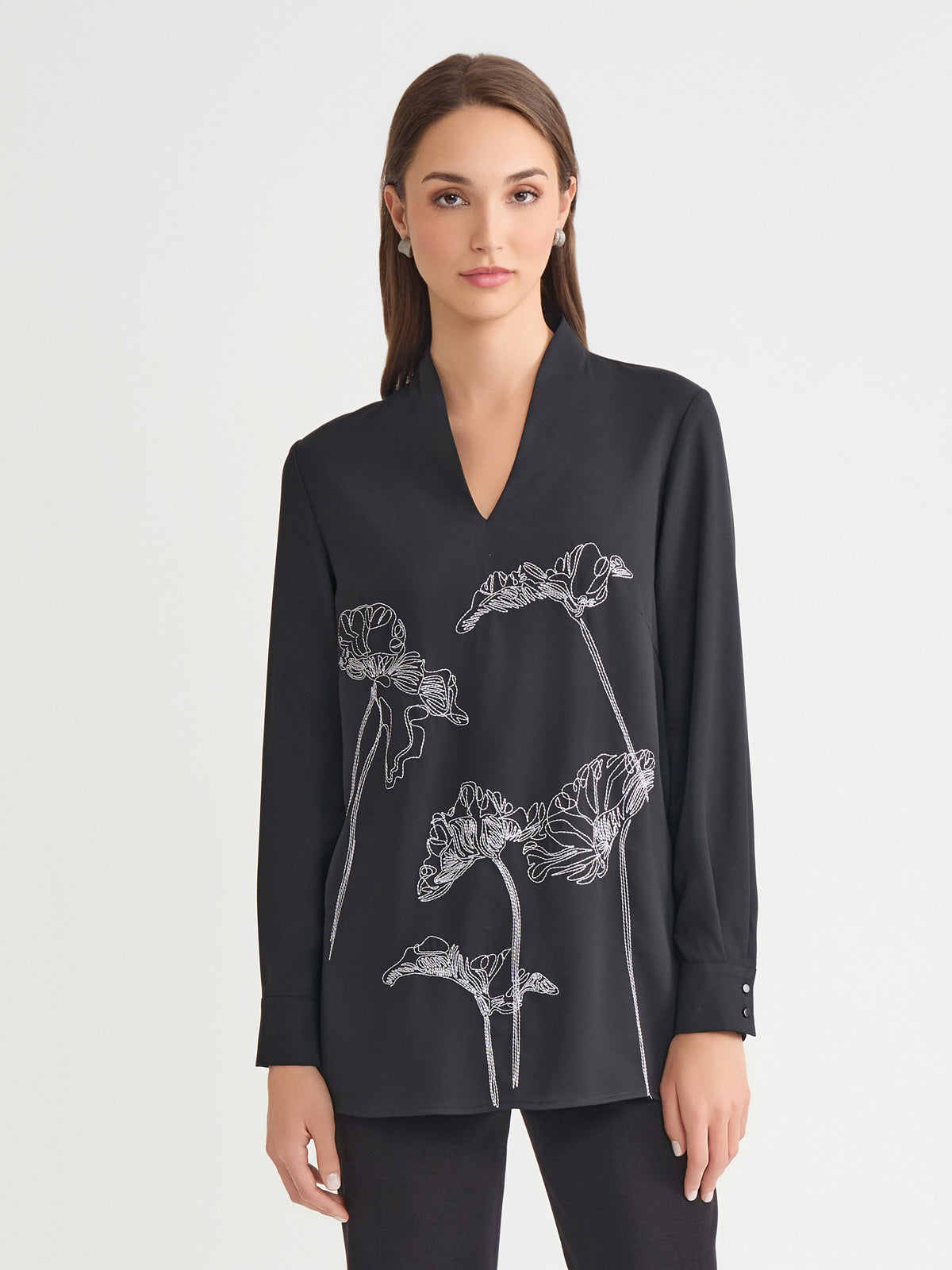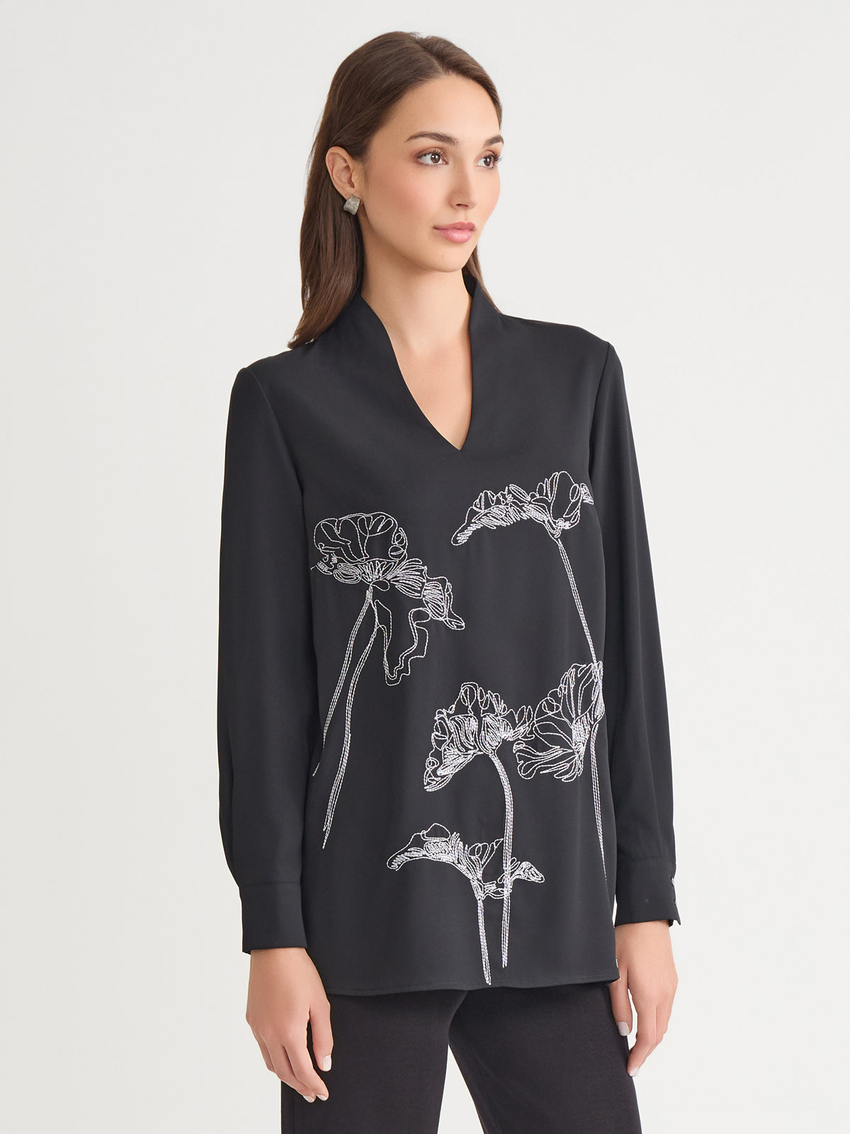 Perfect for office wear, casual outings, or evening events, the Floral Embroidered Crepe de Chine Tunic is a versatile and elegant piece that transitions seamlessly from day to night. Its feminine floral details, flattering fit, and luxurious fabric make it a must-have addition to any wardrobe. Pair this feminine tunic with a pair of seasonless Ponte pants or our best selling knit pants!