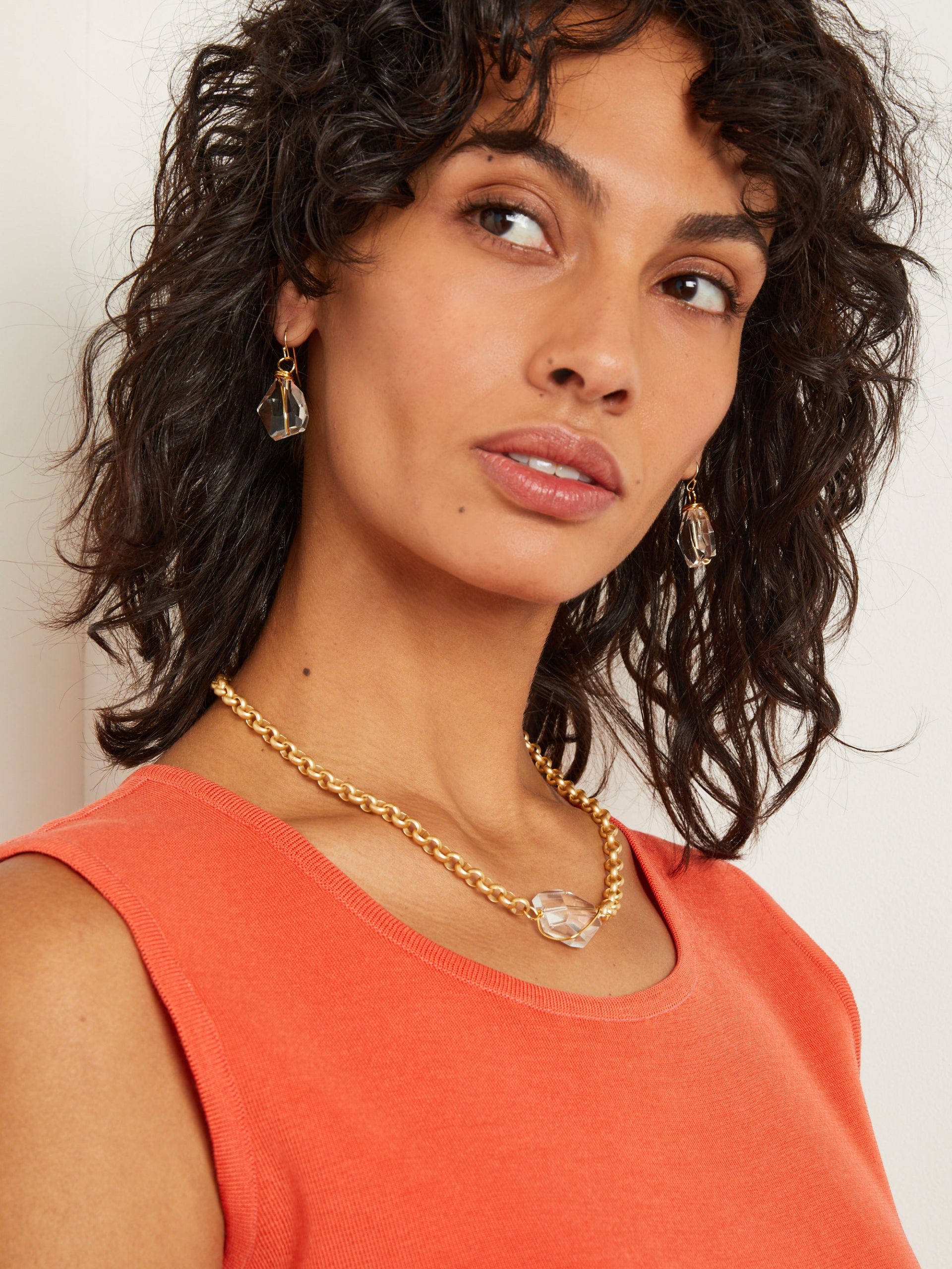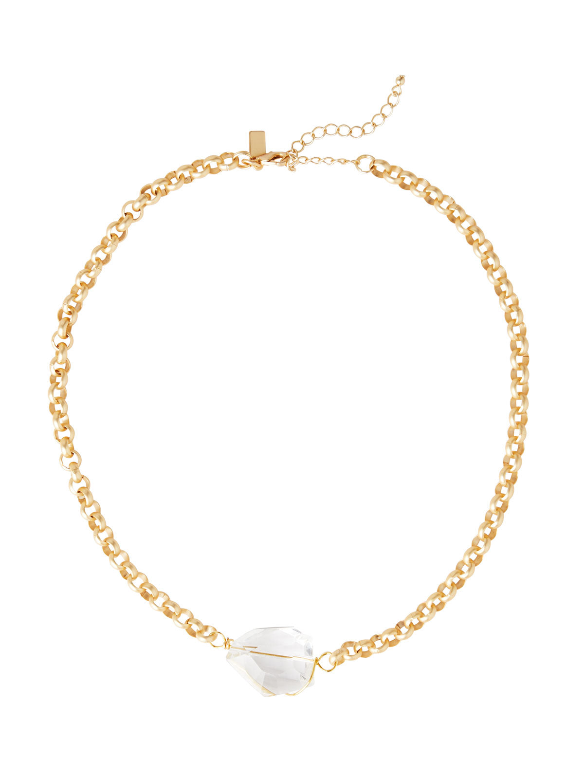 The artisanal craftsmanship of our Handmade Wire Wrapped Crystal Nugget Matte Gold Rolo Chain Necklace is one that boldly combines the beauty of nature with a timeless radiance of matte gold. Faceted to perfectly capture the light, our clear crystal nugget showcases the inner gold wire that connects it to a classic link chain – a fascinating detail that calls attention to its luxurious design.