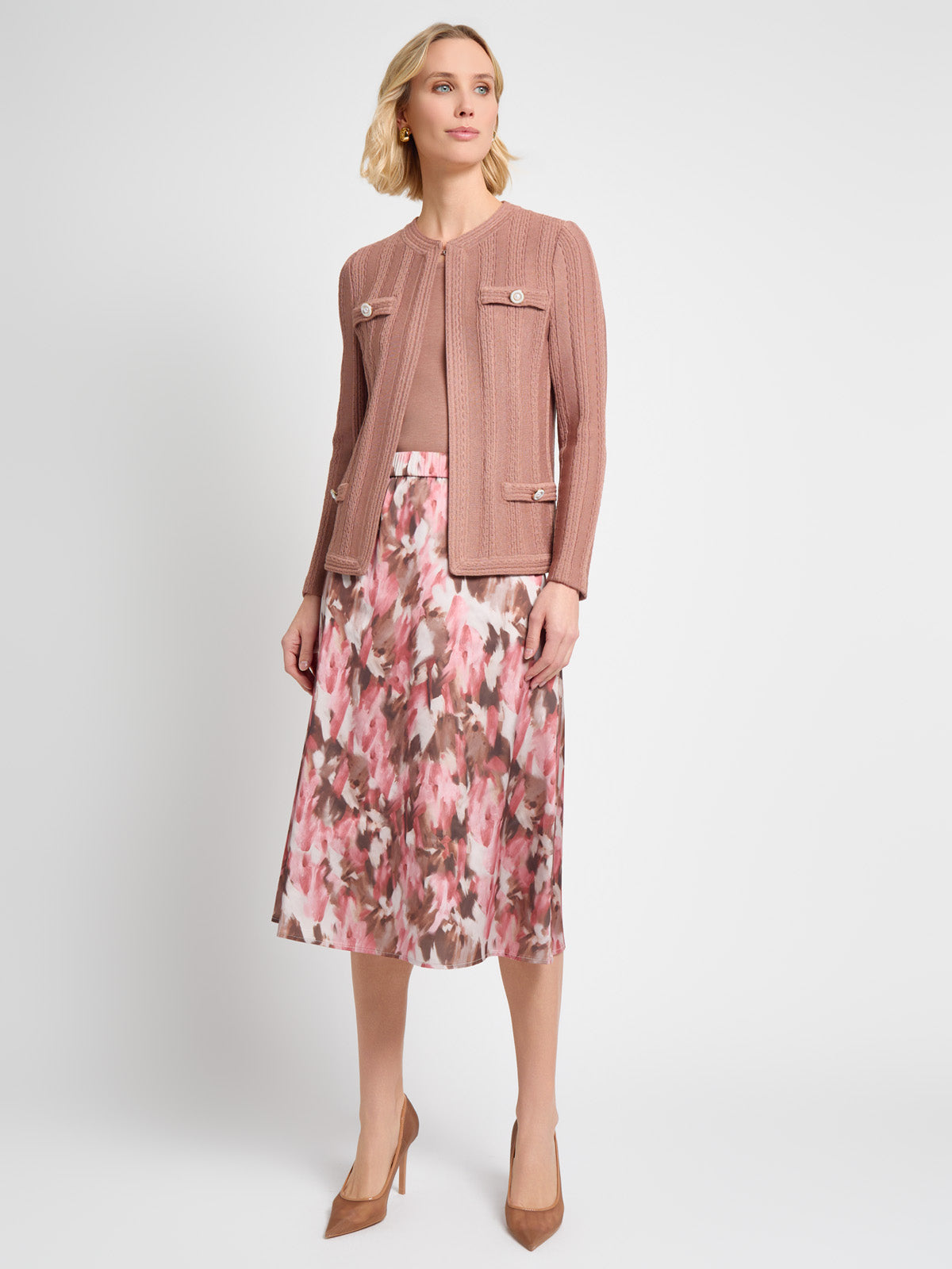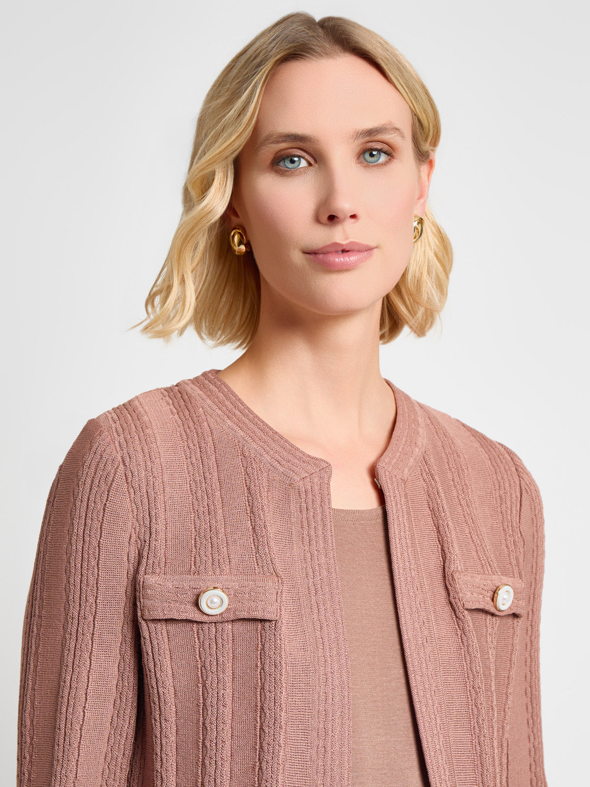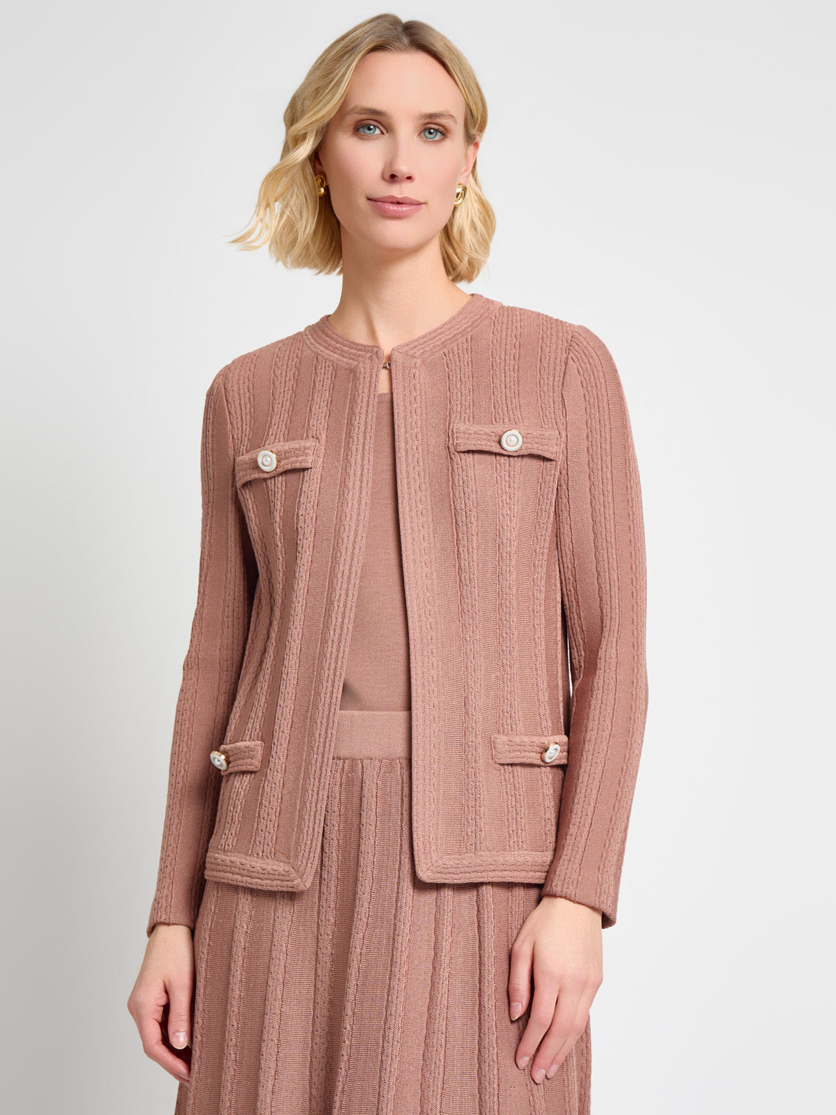 Ideal for both professional and casual settings, the Heritage Braided Cable Soft Knit Jacket adds a touch of elegance to any outfit, offering both style and comfort in one beautiful piece. The jewel neck, hook-and-eye closure, and faux pockets with pearl button accents elevate its style, making it a versatile piece for any wardrobe.
