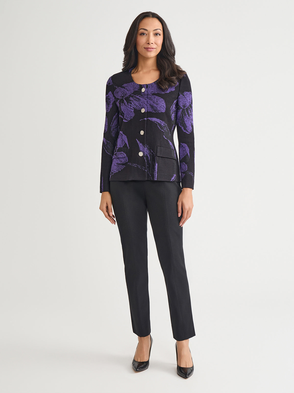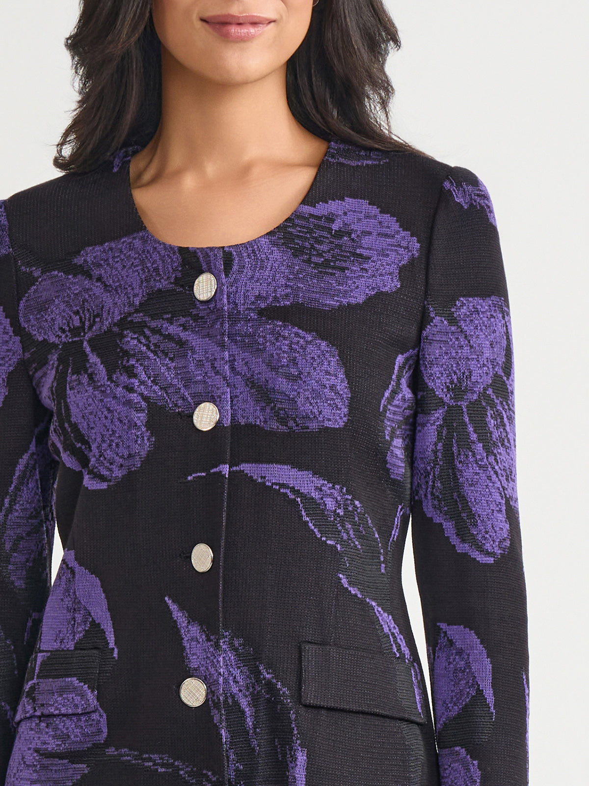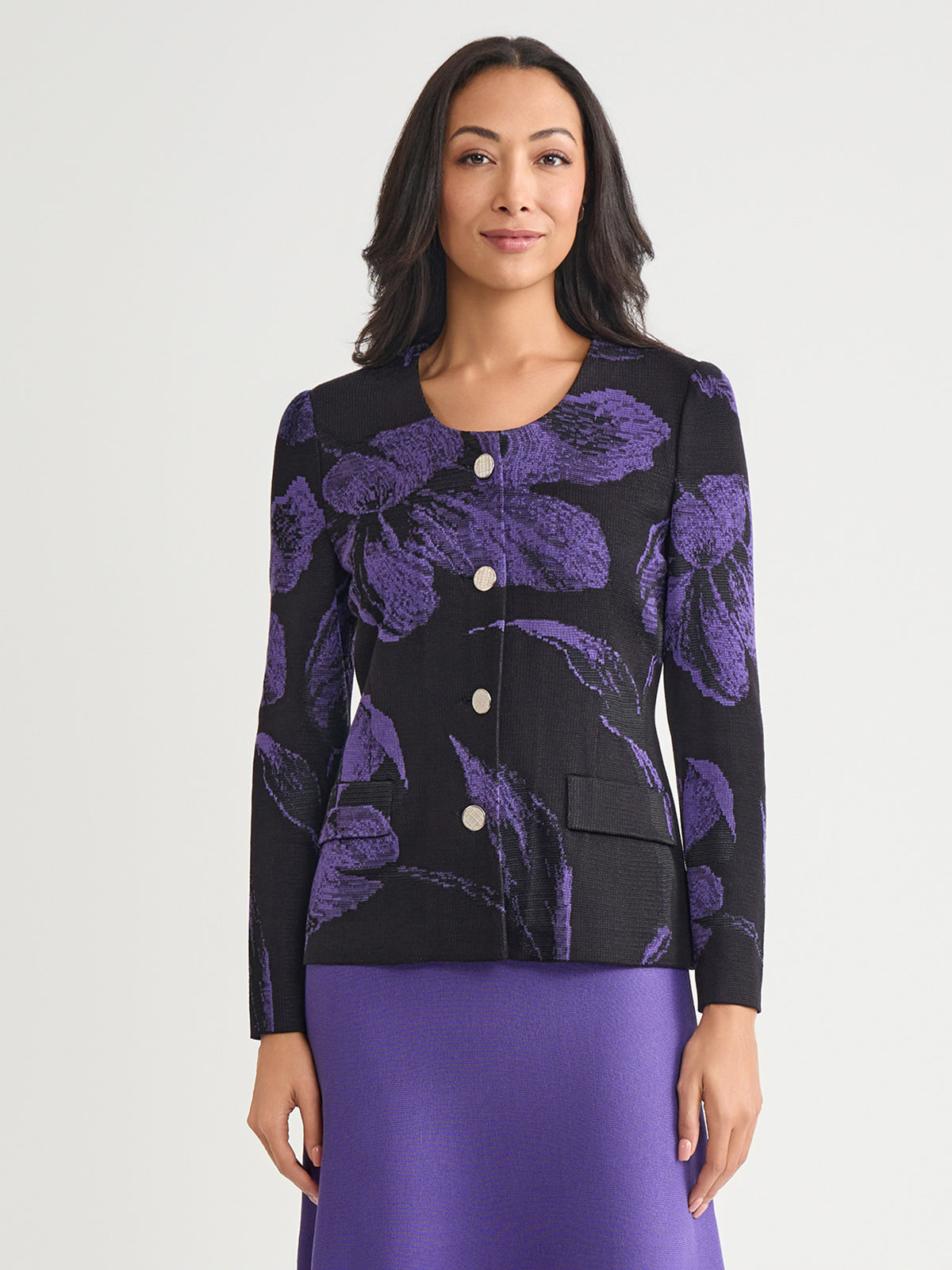 Misook Women’s Heritage Floral Jacquard Knit Jacket – True Fit | Concord Purple & Black