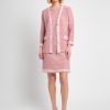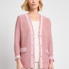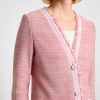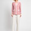 This wrinkle-resistant melange knit jacket combines timeless design with modern detailing. Featuring a flattering heritage silhouette, soft shoulder pads, and a front pearl button closure, this jacket adds a sophisticated touch to any outfit. The fringe trim and faux pocket details enhance its unique, chic look, while the bracelet-length sleeves add a stylish finish.