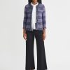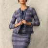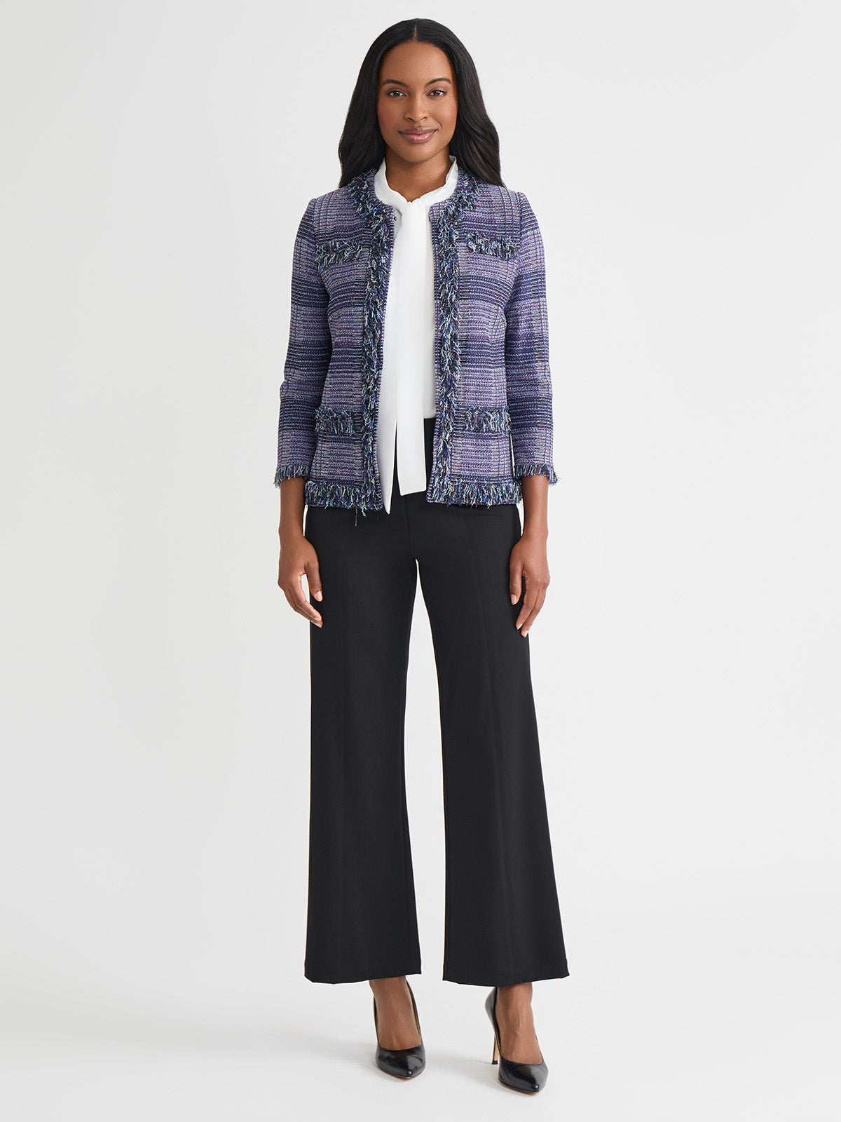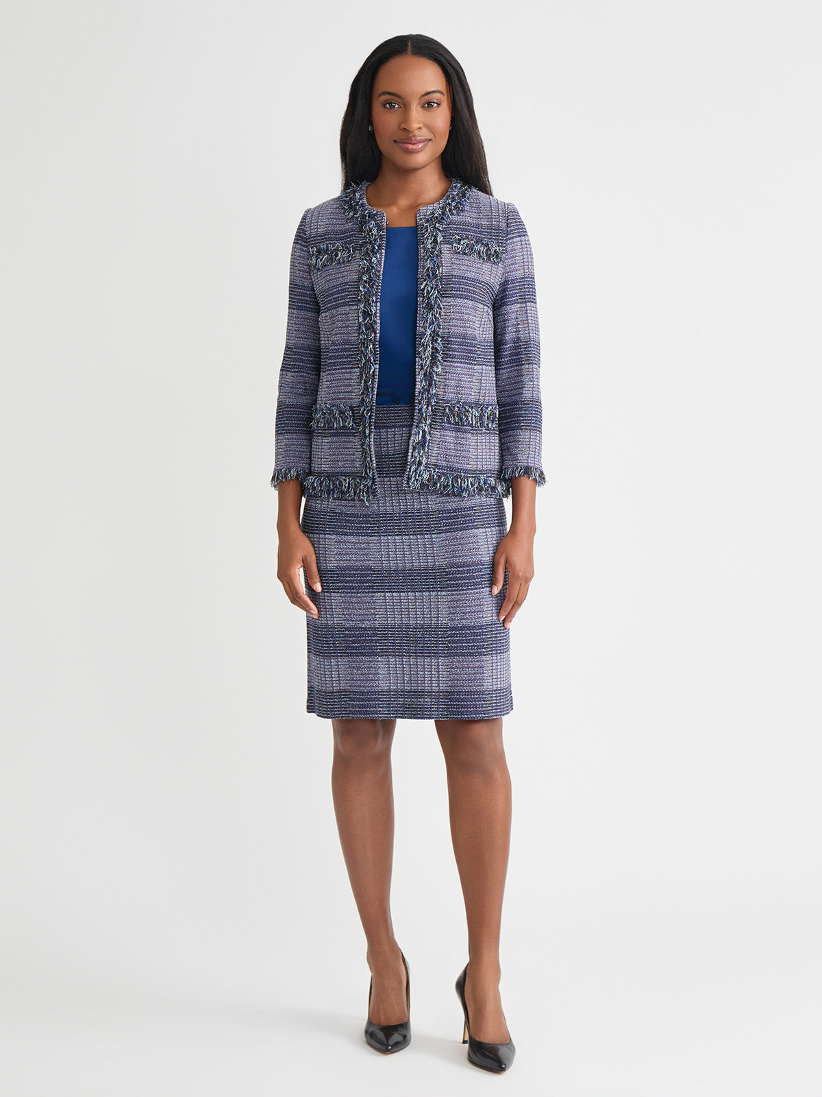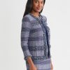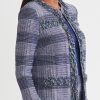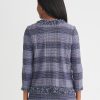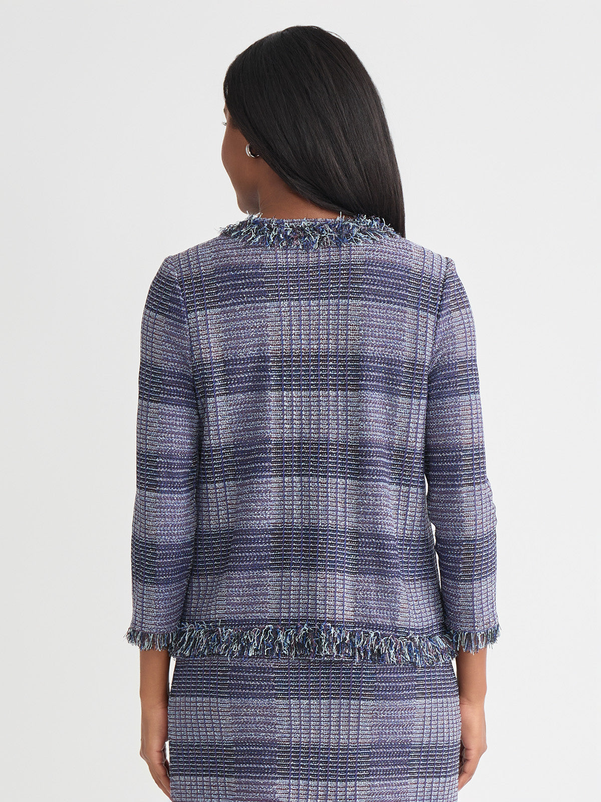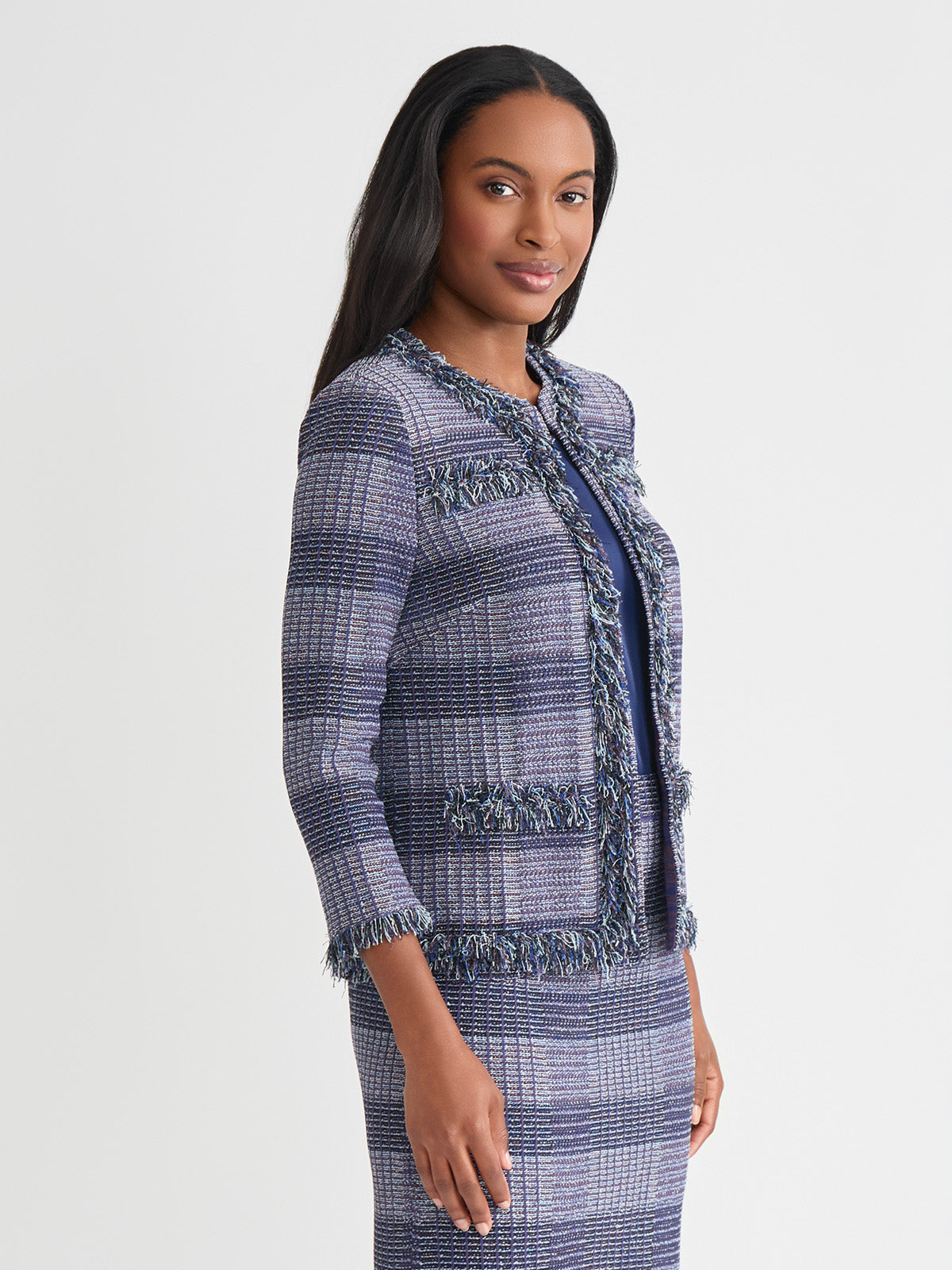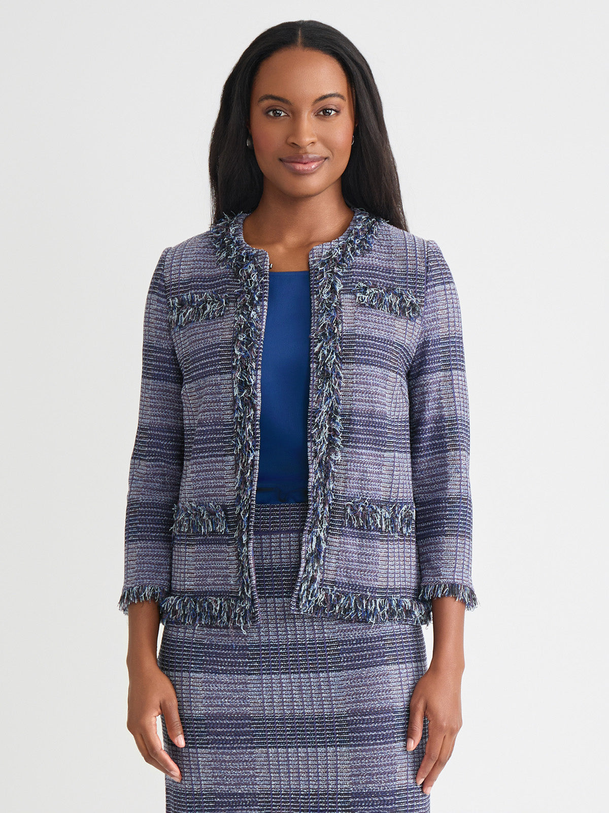 Misook Women’s Heritage Plaid Fringe Trim Knit Jacket – True Fit | Lazuli Blue & Sangria & Blue Frost & Black