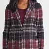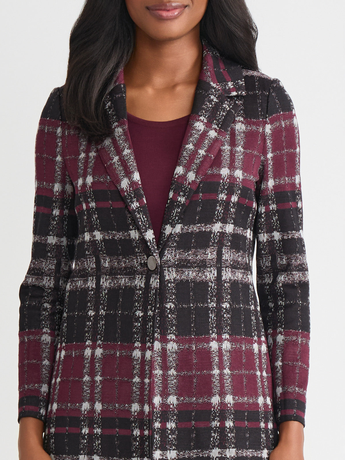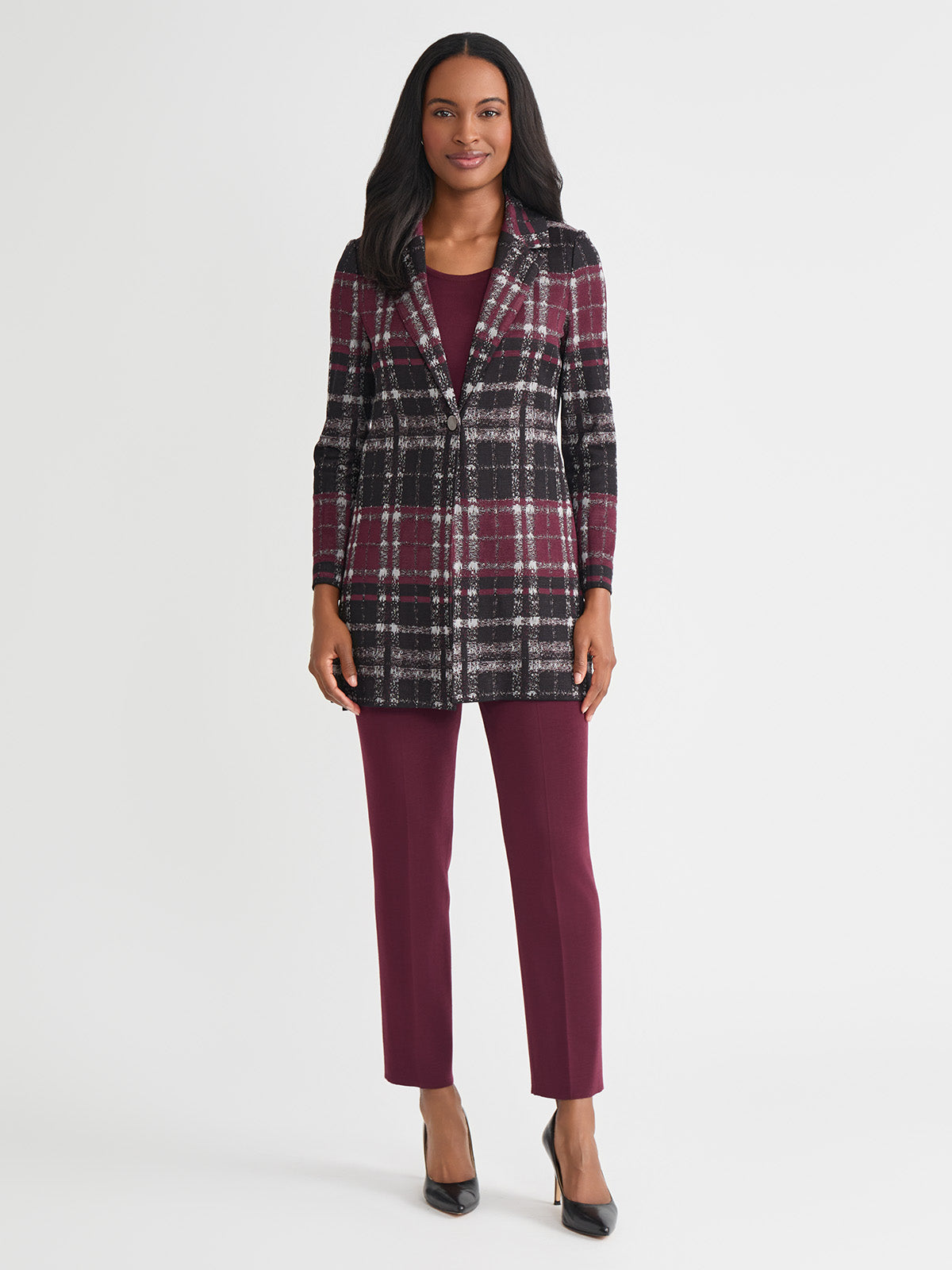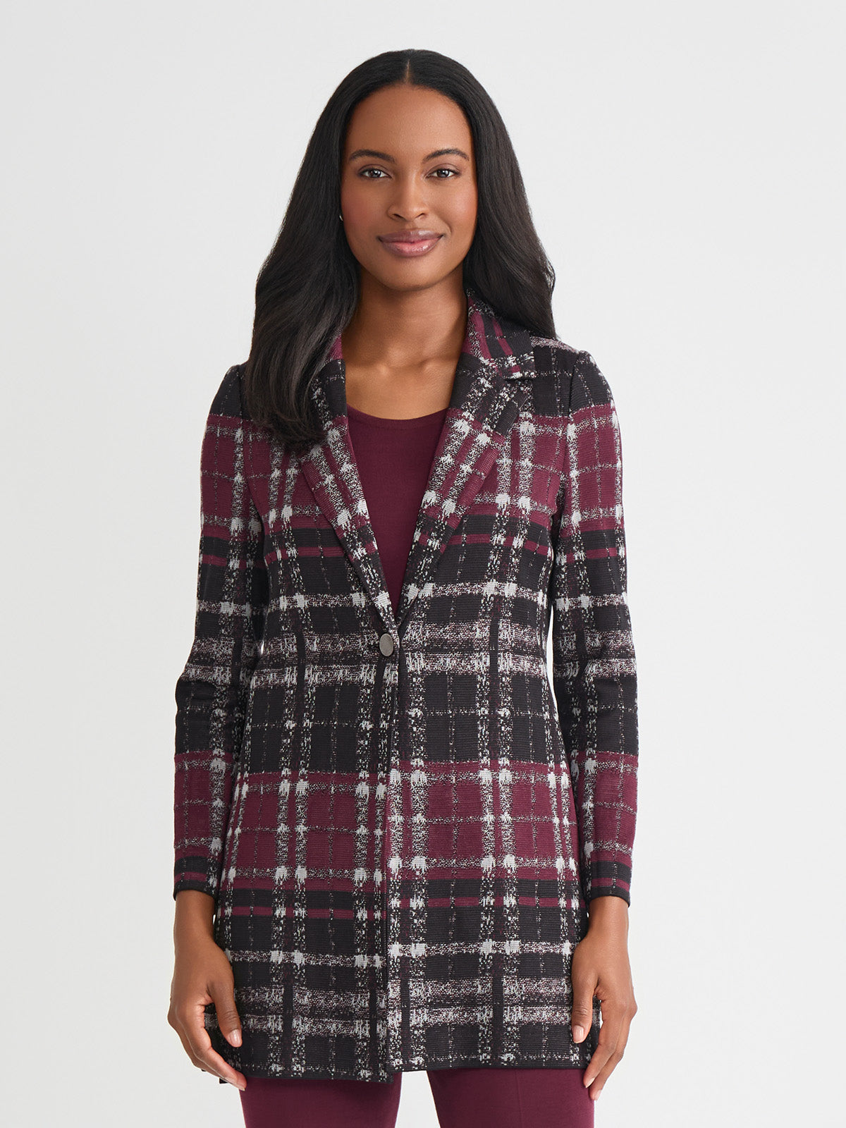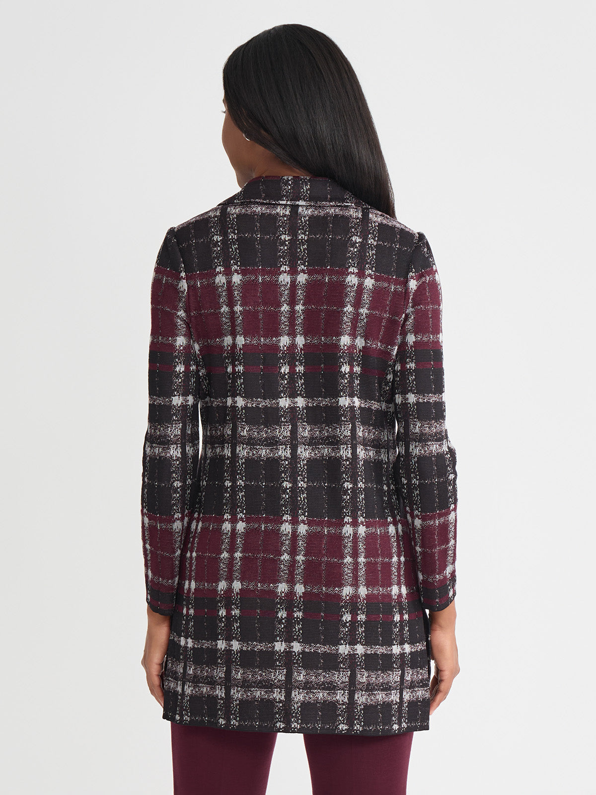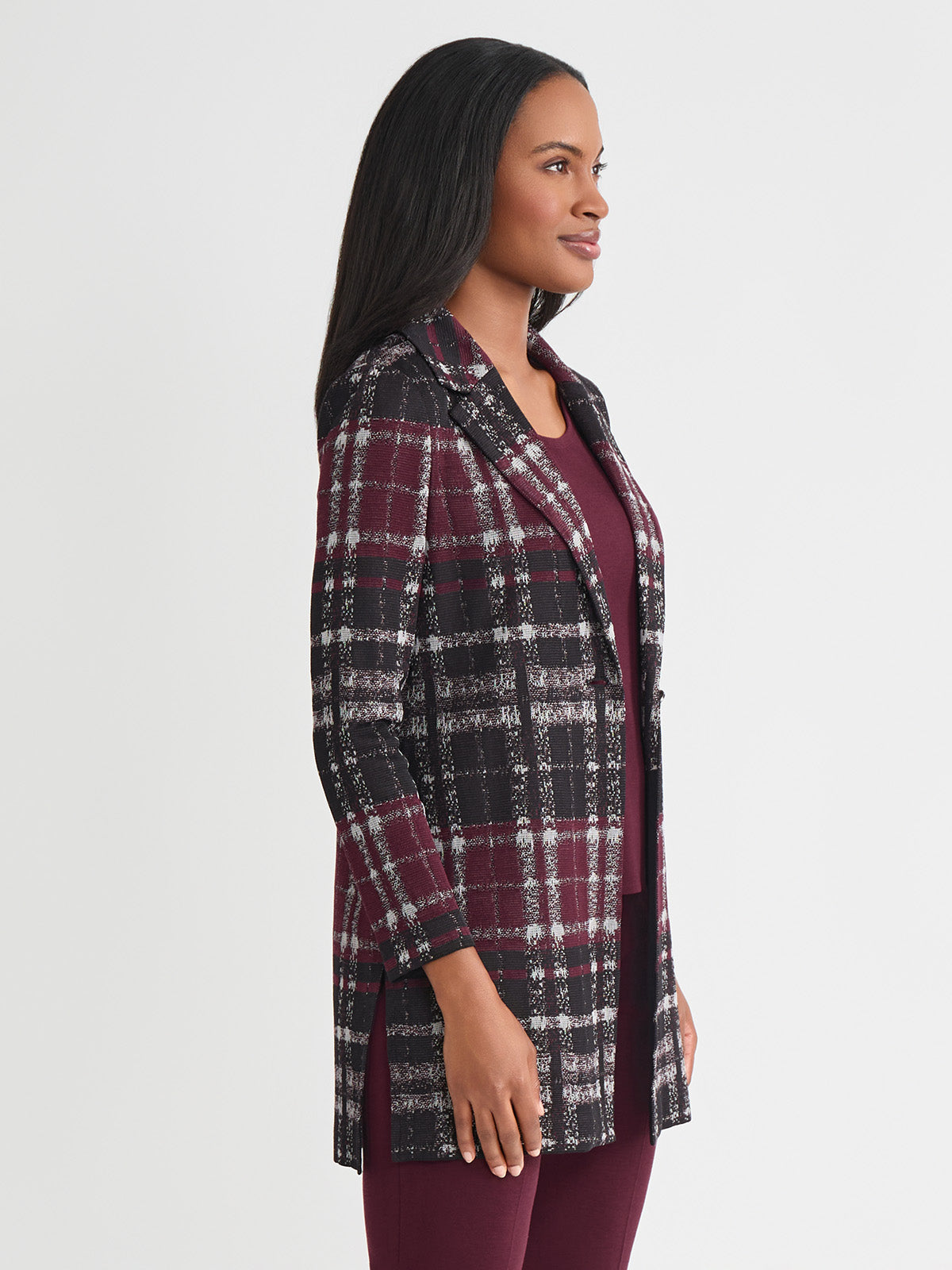 Step into the season with effortless elegance in our Plaid Knit Jacket, a must-have statement piece for your winter soirées and sophisticated gatherings. Designed to flatter, the 32-inch length offers graceful coverage, while the deep side slits add a touch of movement and contemporary flair. The classic notched lapel collar exudes tailored charm, making it ideal for both dressy and semi-formal events. Full-length sleeves provide cozy comfort, perfect for layering over your favorite evening dress or sleek trousers.