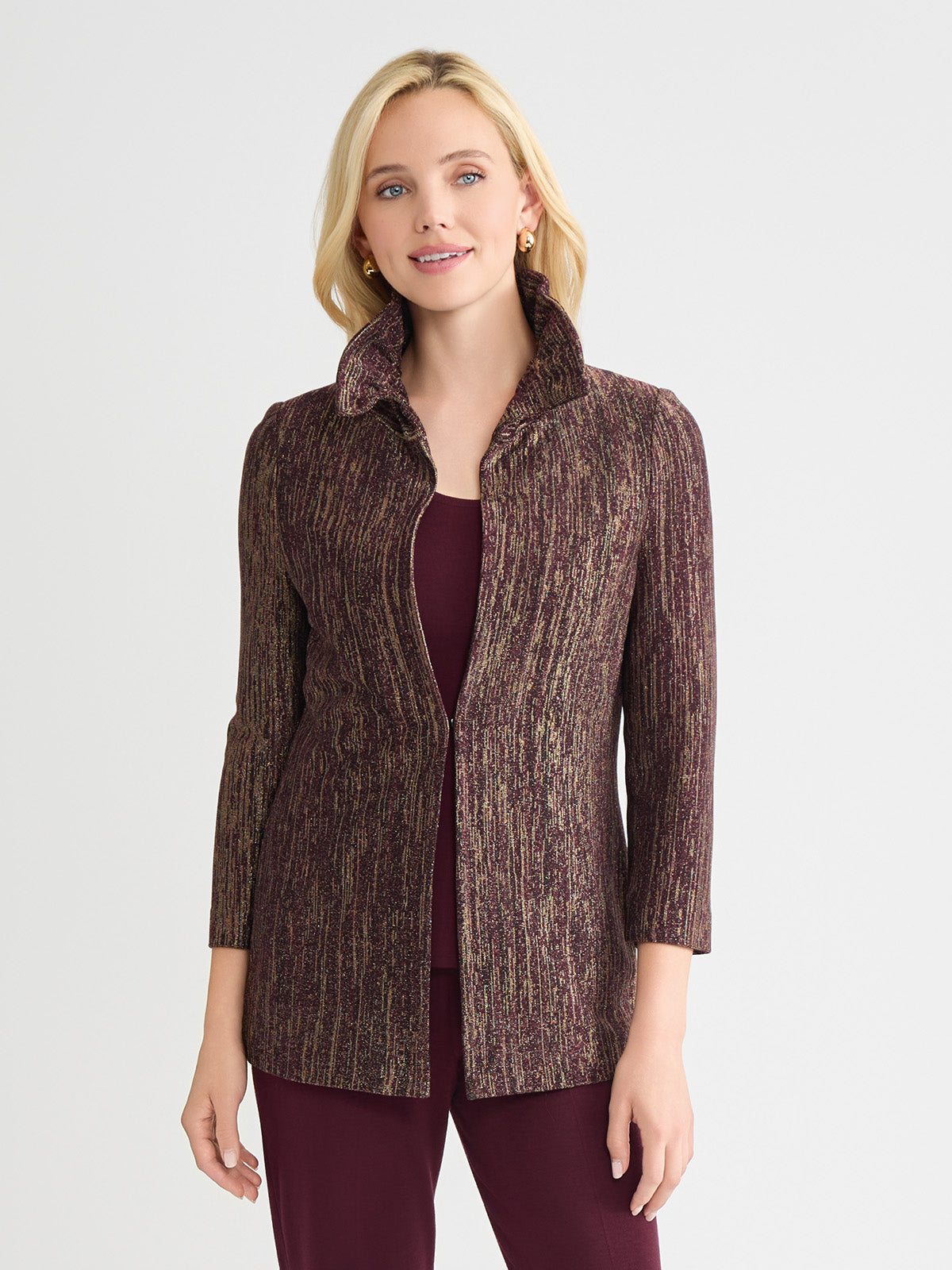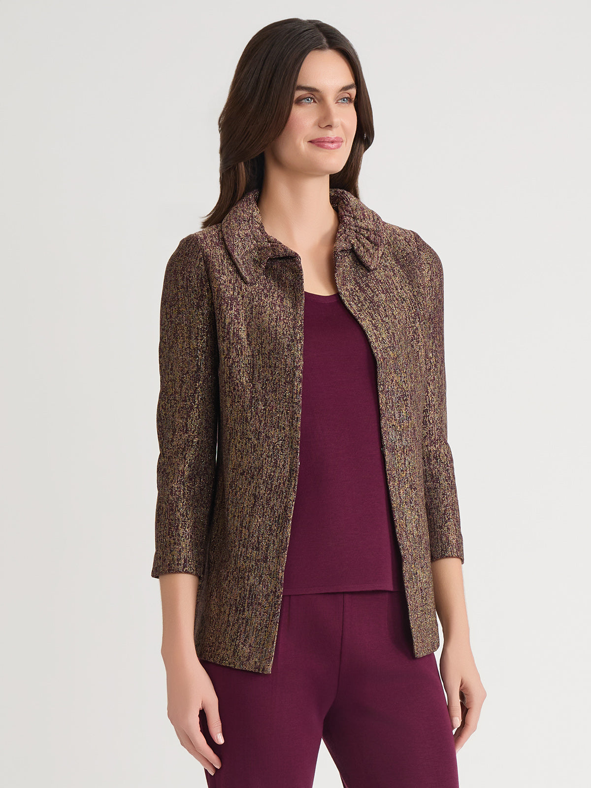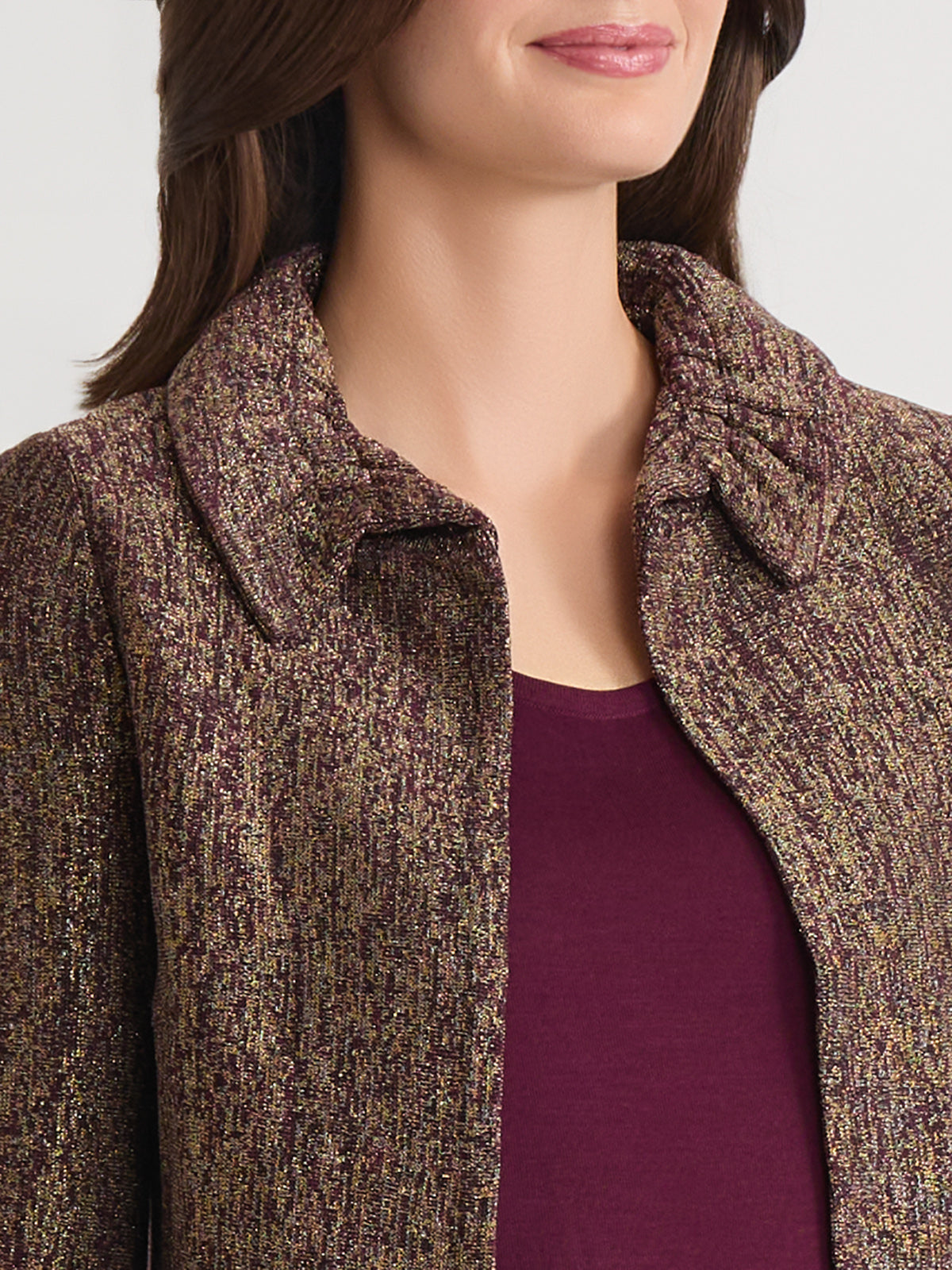 Misook Women’s Heritage Rouched Neck Lurex Knit Jacket – True Fit | Sangria & Black