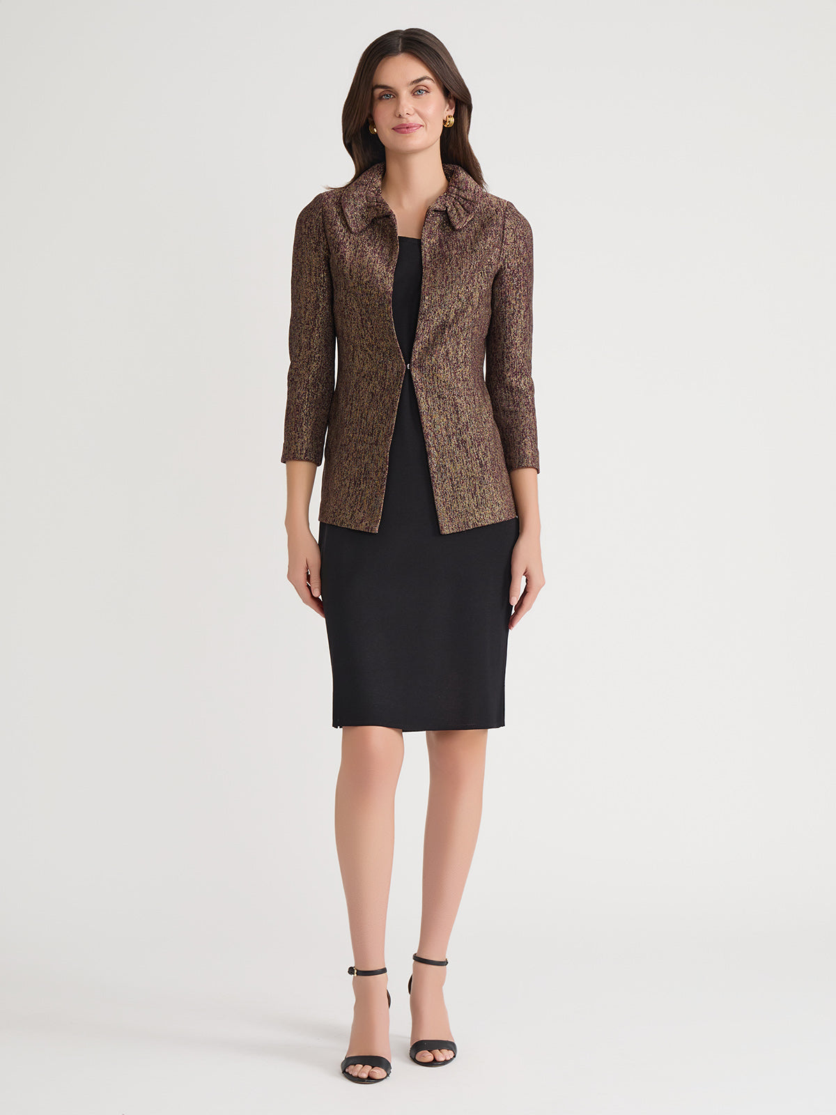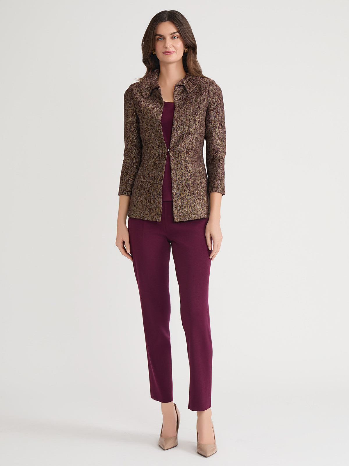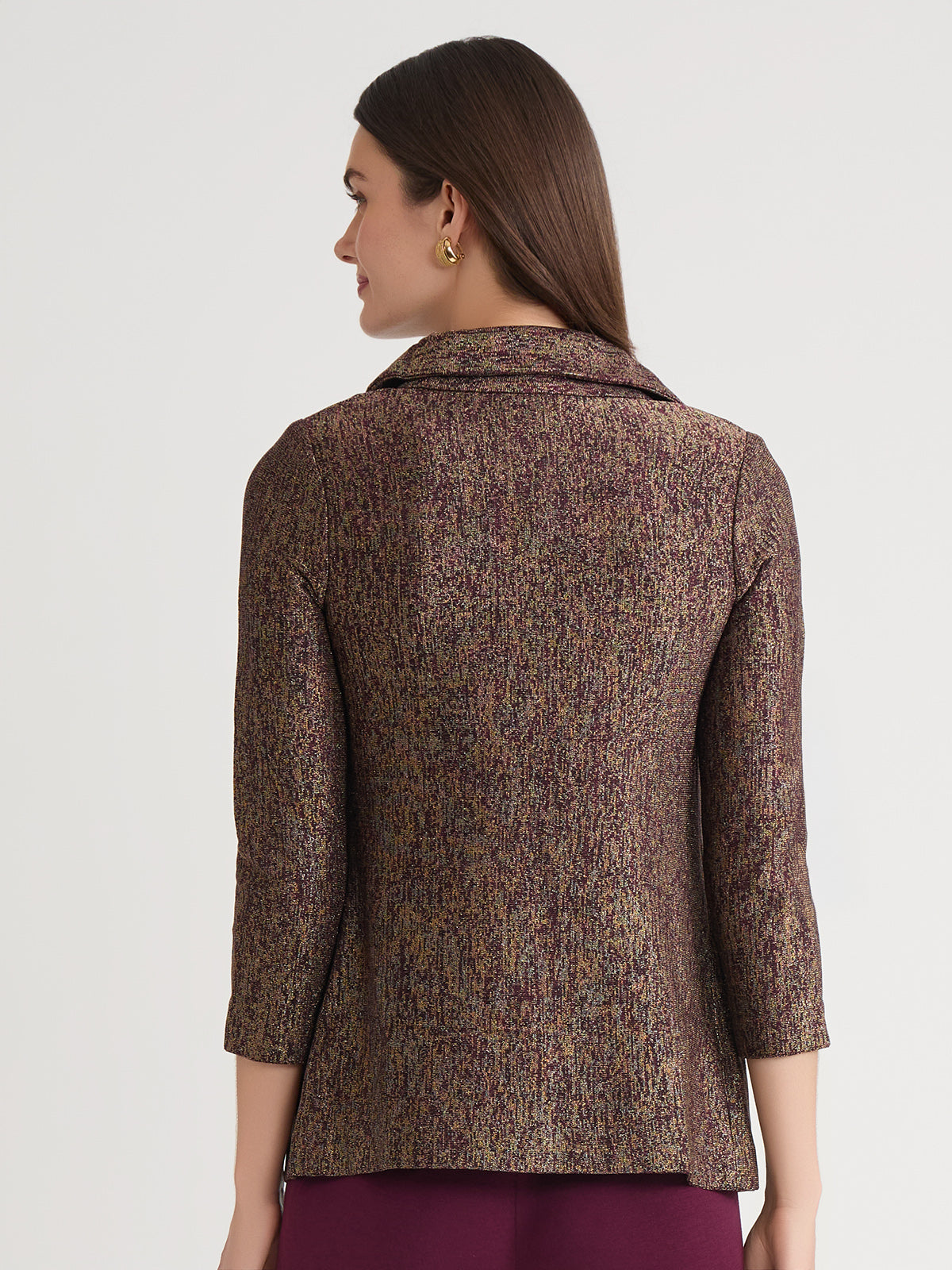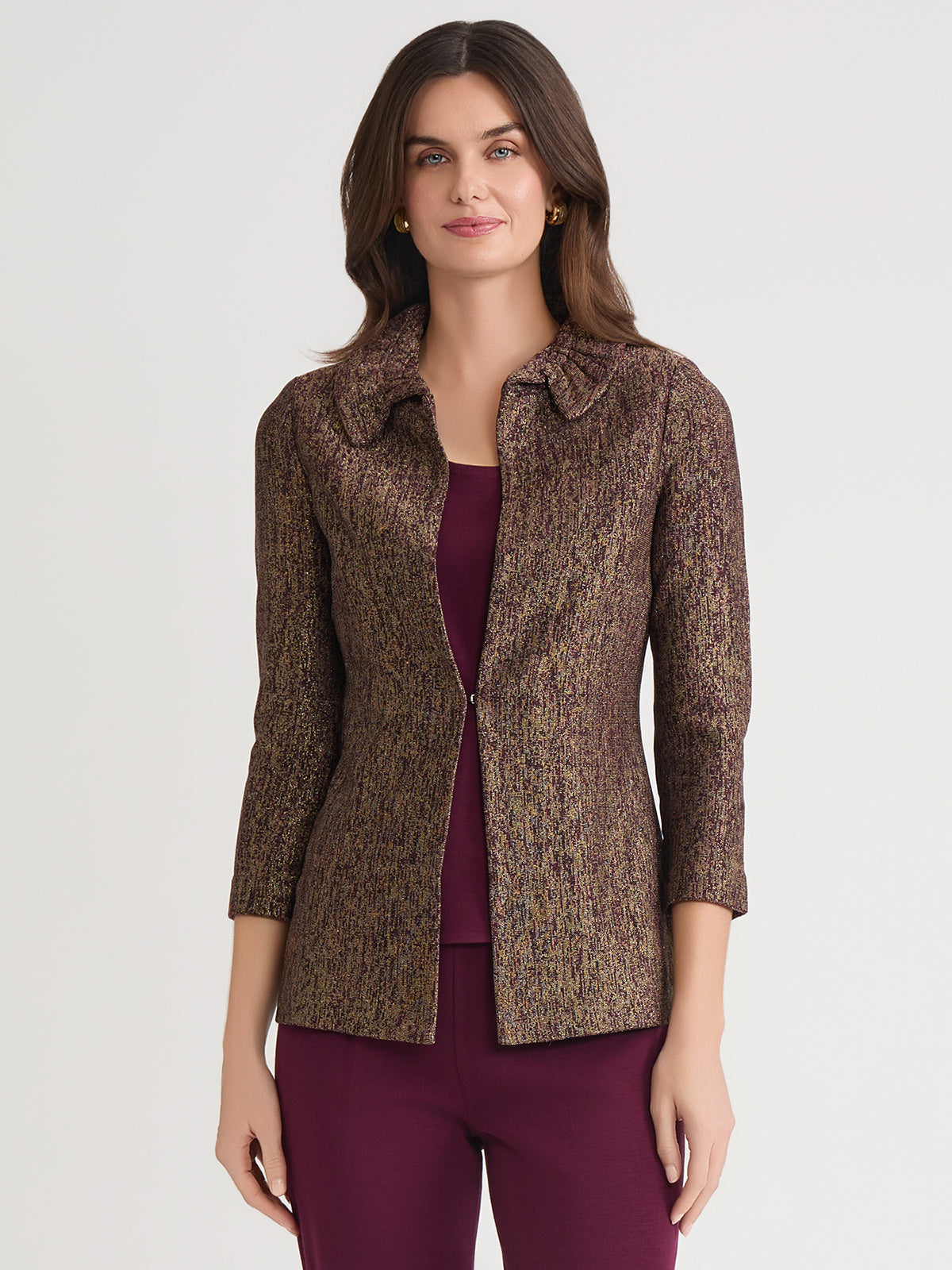 Misook Women’s Heritage Rouched Neck Lurex Knit Jacket – True Fit | Sangria & Black