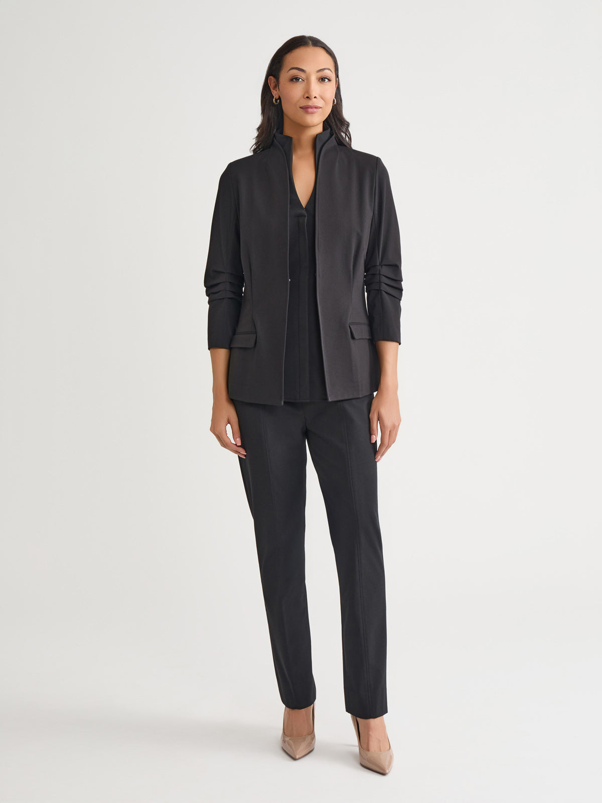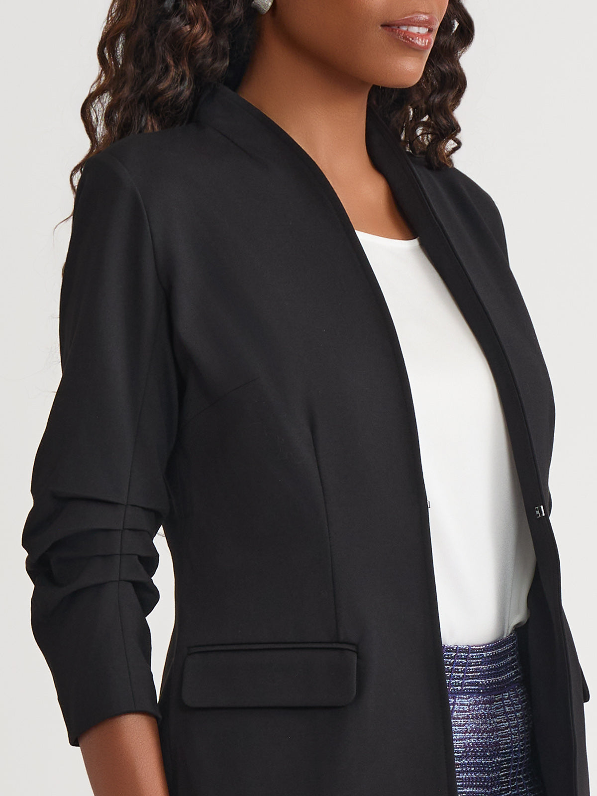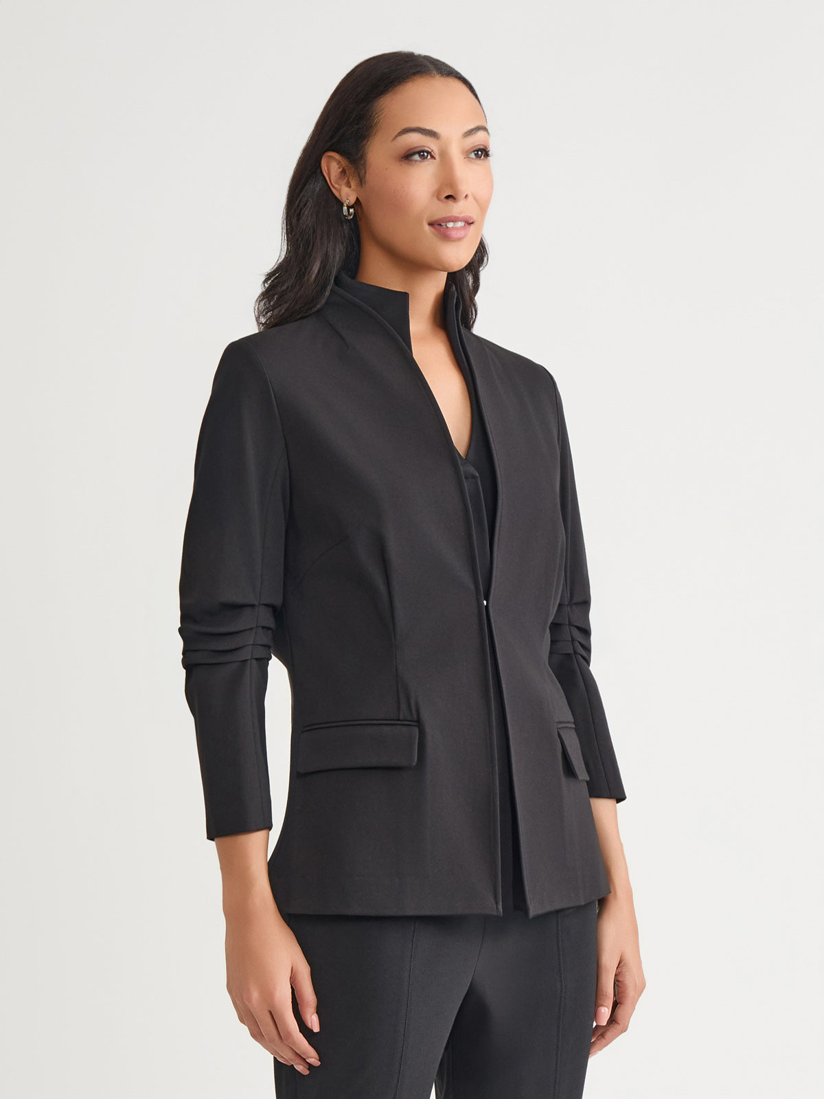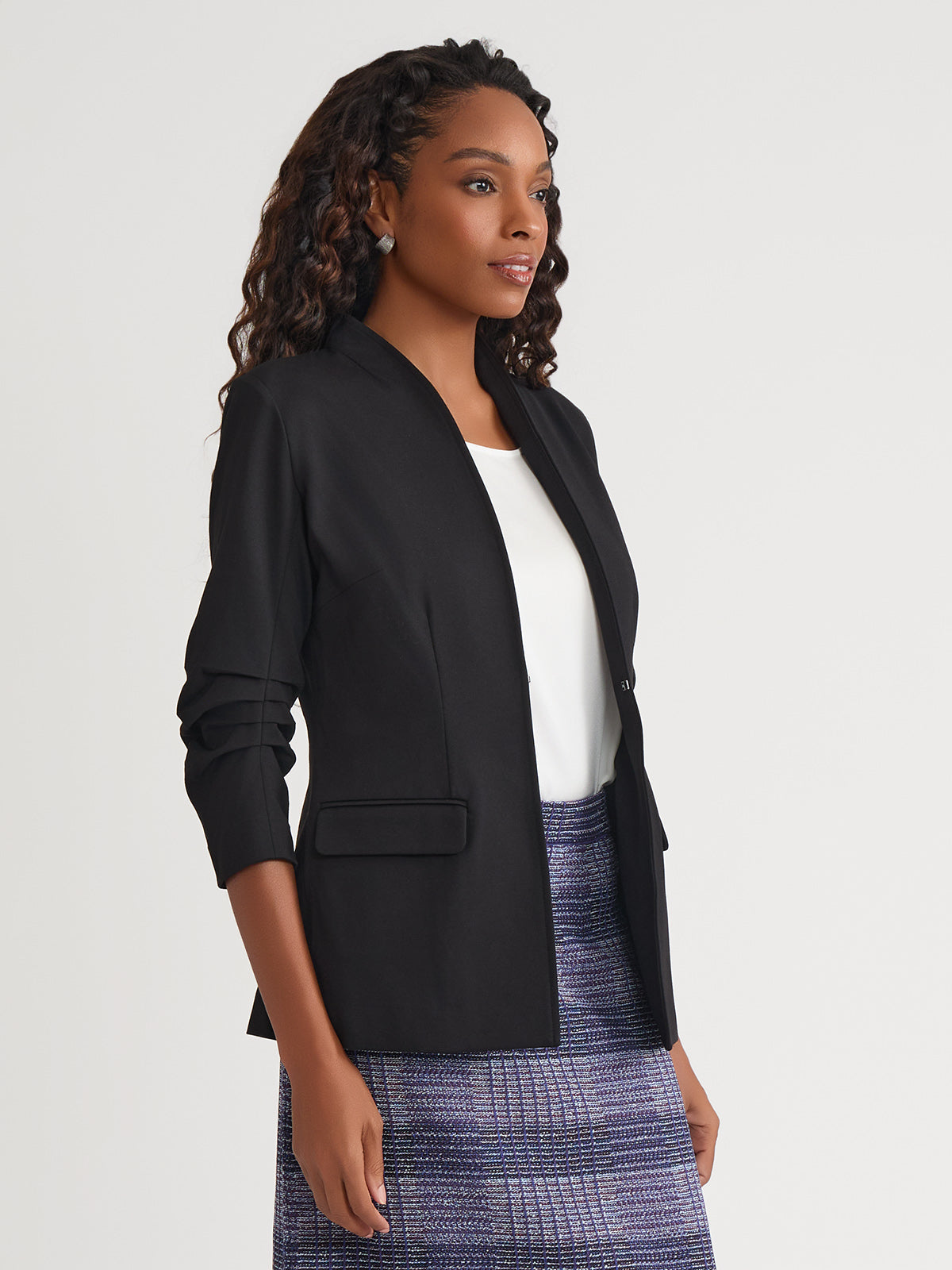 This Stretch Ponte Blazer is the epitome of refined professionalism, expertly designed to complement your work wardrobe with style and sophistication. The pleated detailing at the elbow adds a unique touch, while the modified mandarin neckline provides a modern and sleek look. Functional pockets offer both style and practicality, ensuring convenience throughout your busy day. With a tailored fit that contours to your shape, this blazer delivers a flattering silhouette and unmatched comfort, making it an essential piece for any professional setting.