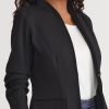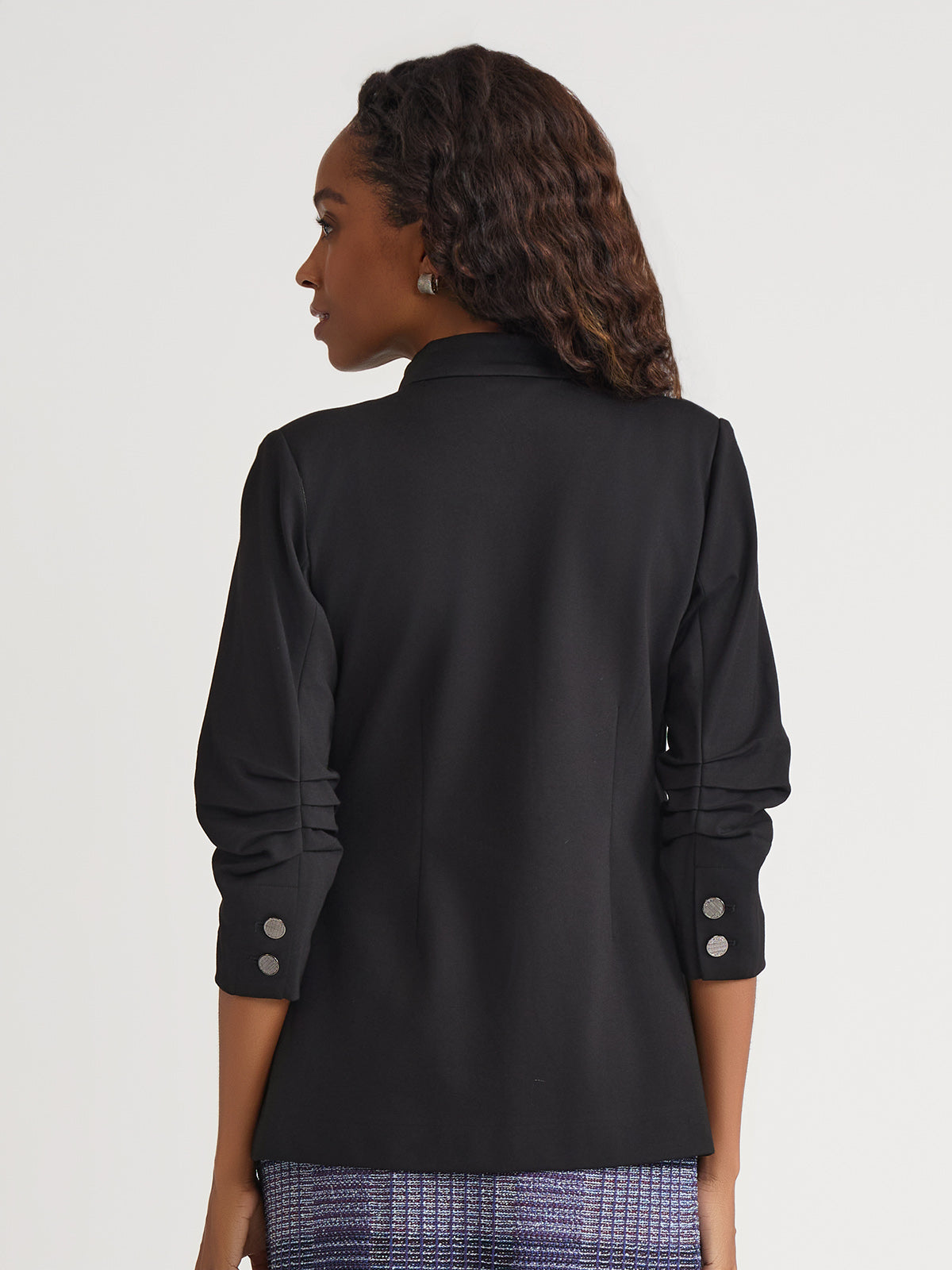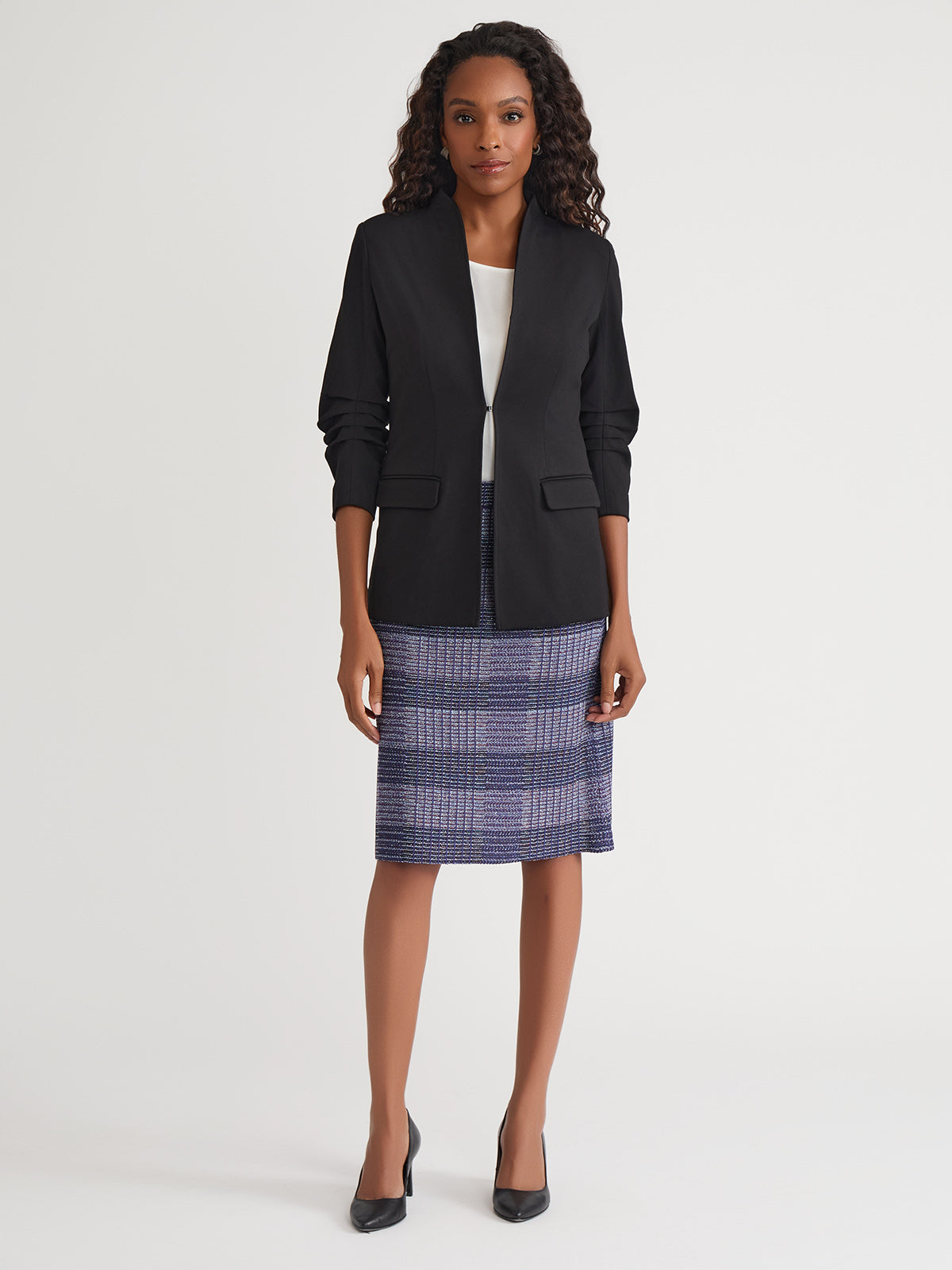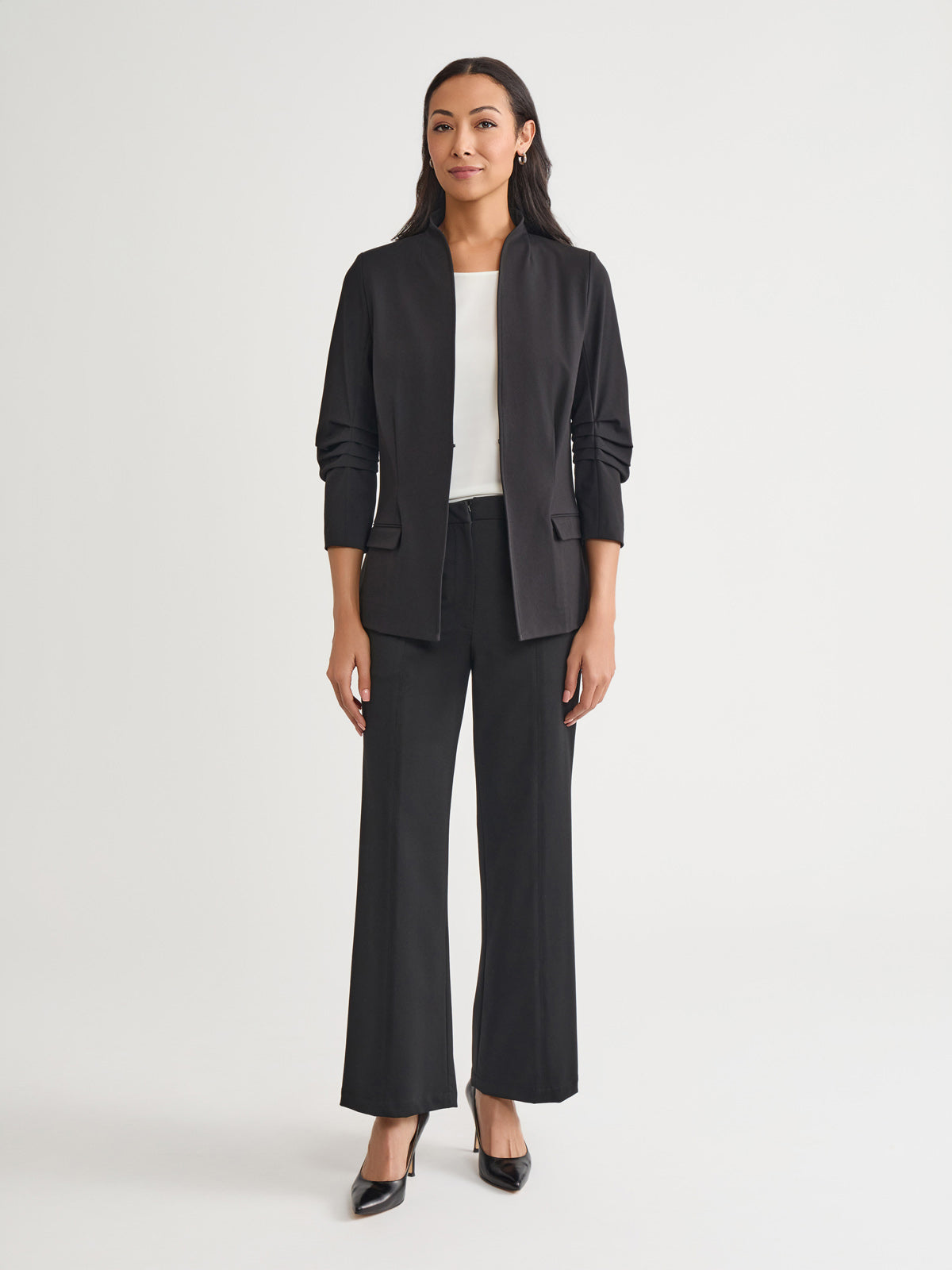 This Stretch Ponte Blazer is the epitome of refined professionalism, expertly designed to complement your work wardrobe with style and sophistication. The pleated detailing at the elbow adds a unique touch, while the modified mandarin neckline provides a modern and sleek look. Functional pockets offer both style and practicality, ensuring convenience throughout your busy day. With a tailored fit that contours to your shape, this blazer delivers a flattering silhouette and unmatched comfort, making it an essential piece for any professional setting.