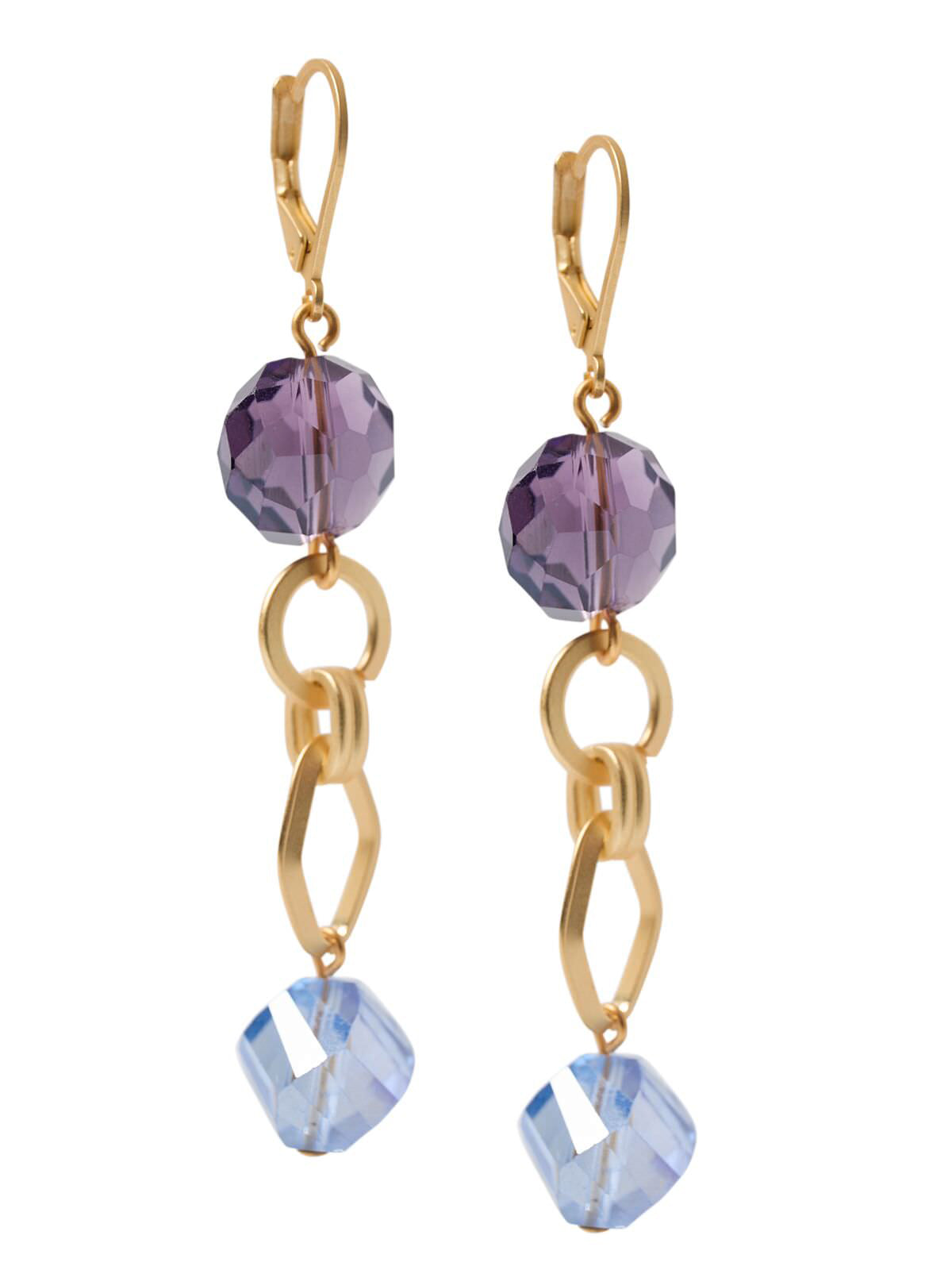 Dazzle your friends with these gorgeous crystal earrings. Featuring Tanzanite and Light Blue crystal, these earring are the perfect conversation piece. These earring are plated with 18K matte gold to ensure they never lose their sparkle.